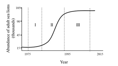 Overfishing reduced food availability for sea lions in California, causing a decline in their population size. In 1972, under the US Endangered Species Act, fishing was banned from sea lion foraging areas. Subsequently, the population of sea lions increased in a logistic form as shown in the figure.