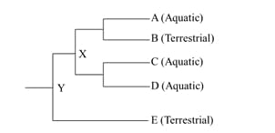 The phylogenetic tree depicts relationships among five snake species (A–E) and their habitat specializations (Aquatic or Terrestrial). Given parsimony (least number of changes) and that ancestor Y was terrestrial, which option about ancestor X is correct?