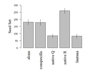 A research team tests how neighbours affect the seed set of a native plant \(S\): grown (i) alone, (ii) with a conspecific, (iii) with native Q, (iv) with native R, (v) with Lantana camara. The bar plot shows mean seed set with 95% CIs. Based on the figure, which option(s) are correct?