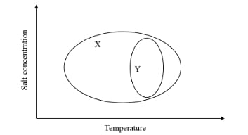 In the figure, ellipse X represents the combinations of salt concentrations and temperatures a marine invertebrate species can tolerate (its potential physiological range). Ellipse Y represents the combinations of salt concentrations and temperatures where the species is actually found. Which one or more of the following statements about X and Y is/are correct?