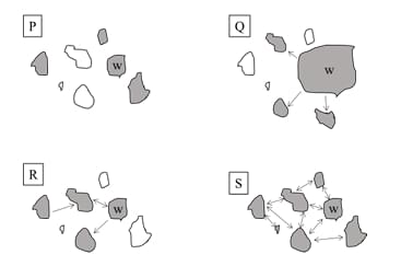 A butterfly species inhabits four patchy landscapes (P, Q, R, S). Grey shapes = occupied patches, white = unoccupied. Arrows = directions of dispersal. Which one or more of the options is/are correct?