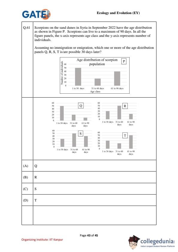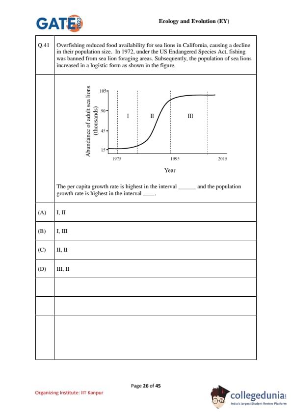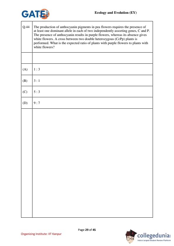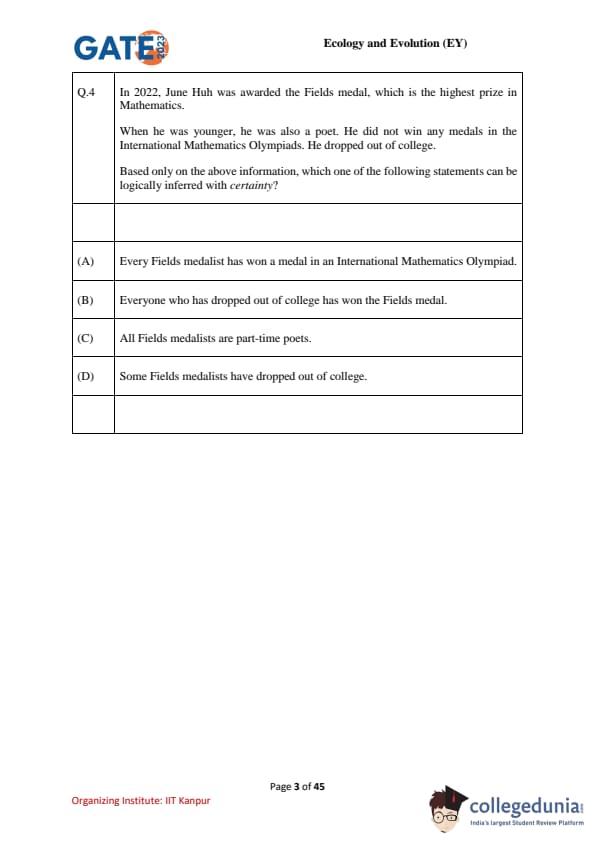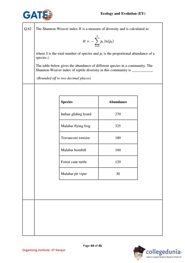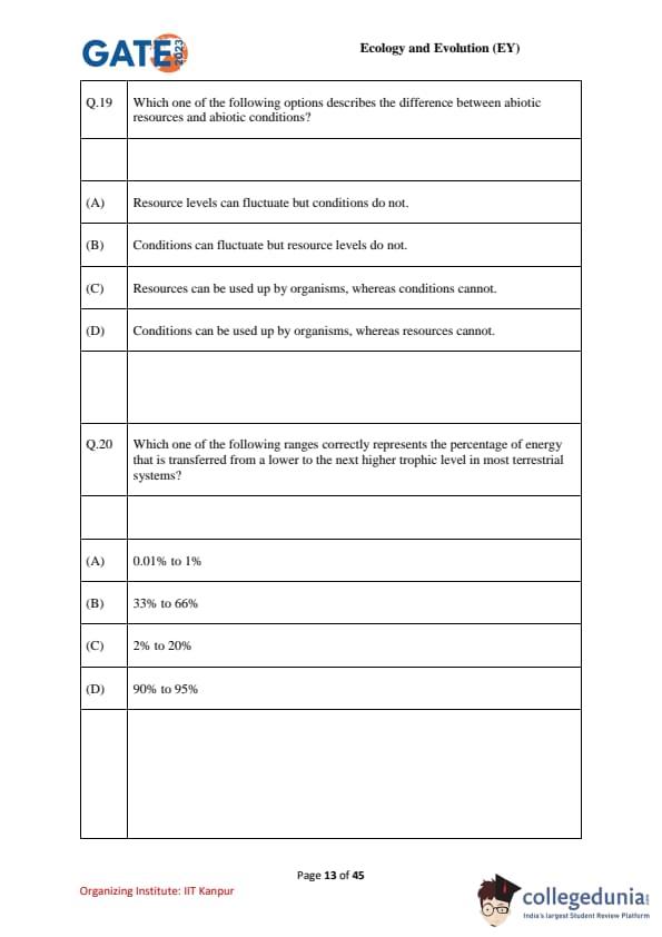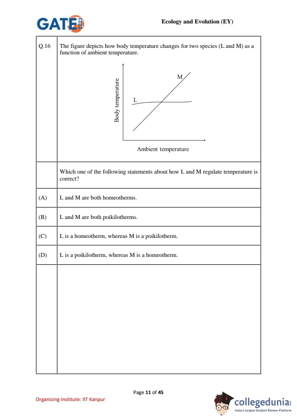 GATE 2023 Ecology and Evolution Question Paper PDF is available here for download. IIT Kanpur conducted GATE 2023 Ecology and Evolution exam on February 11, 2023 in the Afternoon Session from 02:30 PM to 05:30 PM. Students have to answer 65 questions in GATE 2023 Ecology and Evolution Question Paper carrying a total weightage of 100 marks. 10 questions are from the General Aptitude section and 55 questions are from Core Discipline.