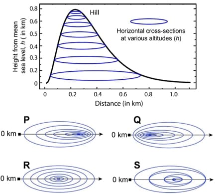 In the given diagram, ovals are marked at different heights (\(h\)) of a hill. Which one of the following options P, Q, R, and S depicts the top view of the hill?