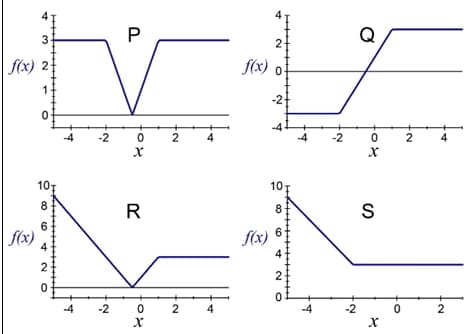 Which one of the given figures P, Q, R and S represents the graph of the following function? \[ f(x)=\left|\,|x+2|-|x-1|\,\right| \]