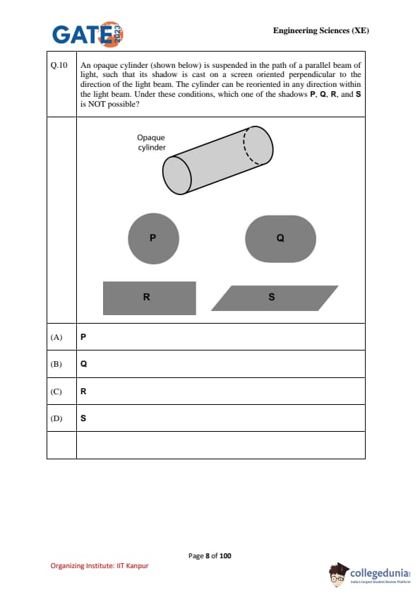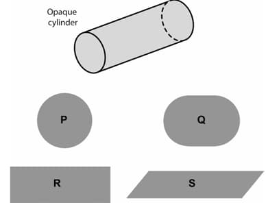 An opaque cylinder (shown below) is suspended in the path of a parallel beam of light, such that its shadow is cast on a screen oriented perpendicular to the direction of the light beam. The cylinder can be reoriented in any direction within the light beam. Under these conditions, which one of the shadows P, Q, R, and S is NOT possible?
