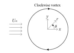 An inviscid steady incompressible flow is formed by combining a uniform flow with velocity \(U_\infty\) and a clockwise vortex of strength \(K\) at the origin, as shown in the figure. Velocity potential (\(\phi\)) for the combined flow in polar coordinates \((r,\theta)\) is