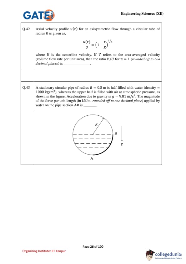A stationary circular pipe of radius \(R = 0.5\) m is half filled with water (density = 1000 kg/m\(^3\)), whereas the upper half is filled with air at atmospheric pressure, as shown in the figure. Acceleration due to gravity is \(g = 9.81\) m/s\(^2\). The magnitude of the force per unit length (in kN/m, rounded off to one decimal place) applied by water on the pipe section AB is \(\_\_\_\_\_\_\_\_\).
