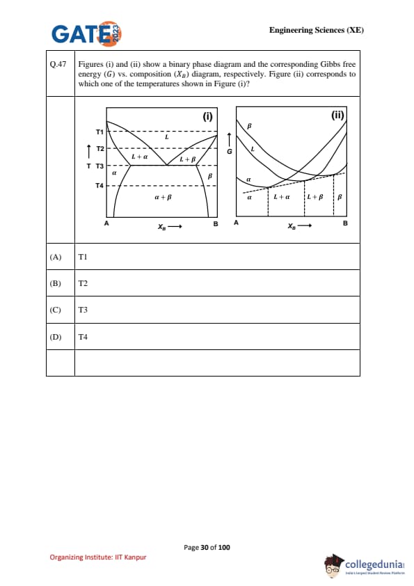 Figures (i) and (ii) show a binary phase diagram and the corresponding Gibbs free energy (G) vs. composition (\(X_B\)) diagram, respectively. Figure (ii) corresponds to which one of the temperatures shown in Figure (i)?