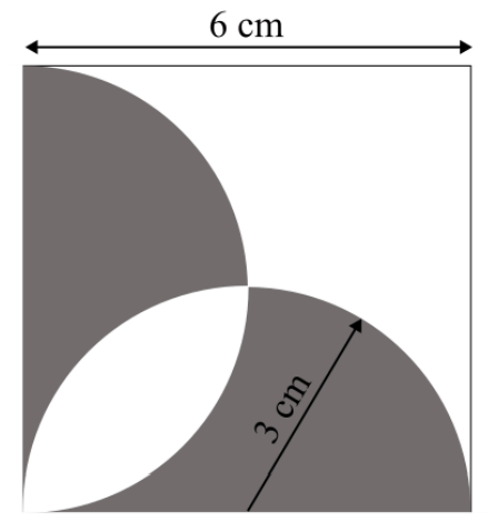 A square with sides of length \(6\,cm\) is given. The boundary of the shaded region is defined by two semi-circles whose diameters are the sides of the square, as shown. The area of the shaded region is ______ \(cm^2\).