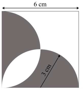 A square with sides of length \(6\,cm\) is given. The boundary of the shaded region is defined by two semi-circles whose diameters are the sides of the square, as shown. The area of the shaded region is ______ \(cm^2\).