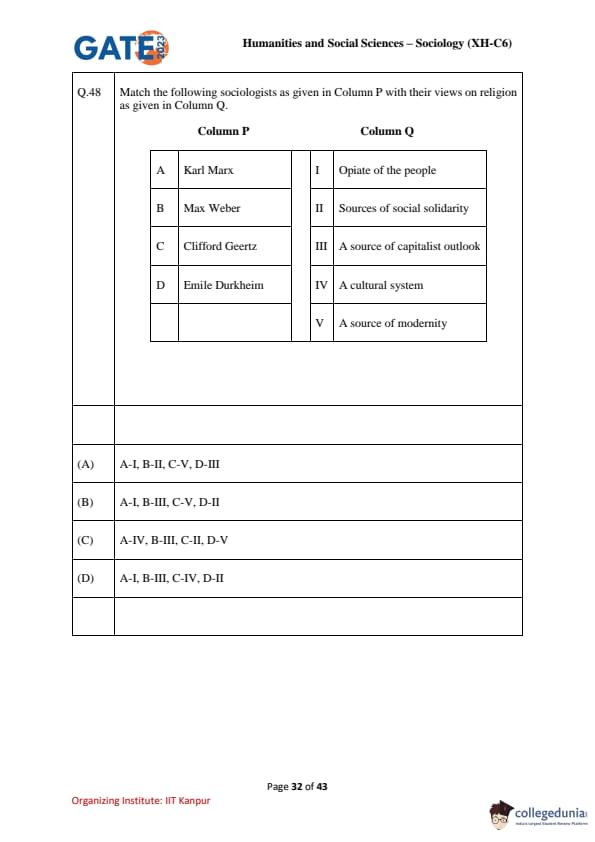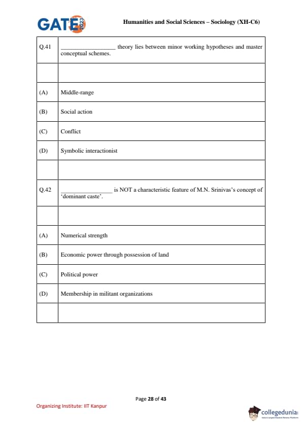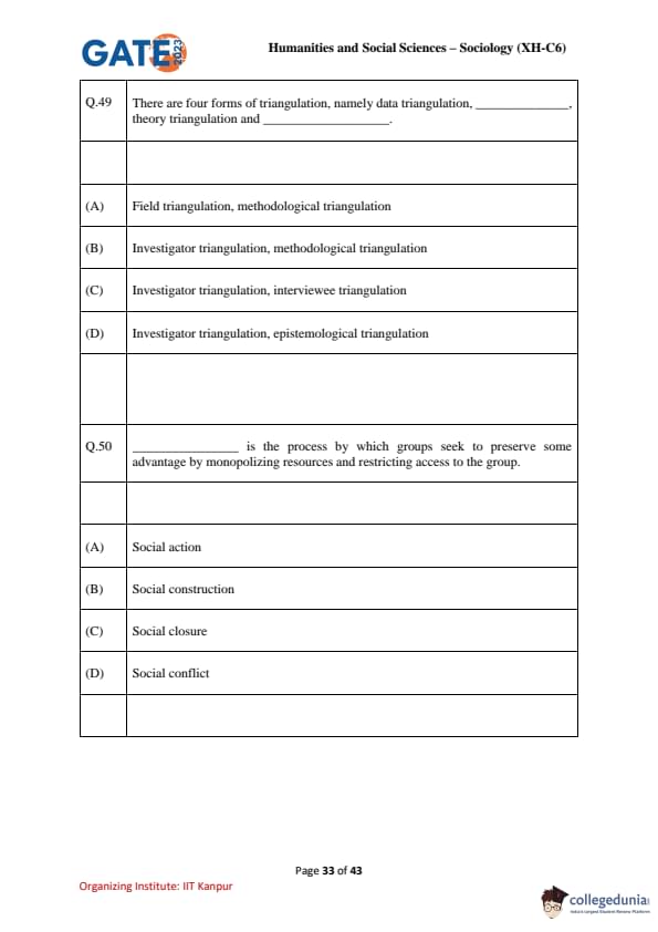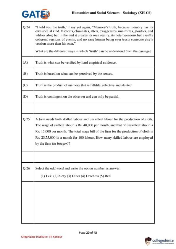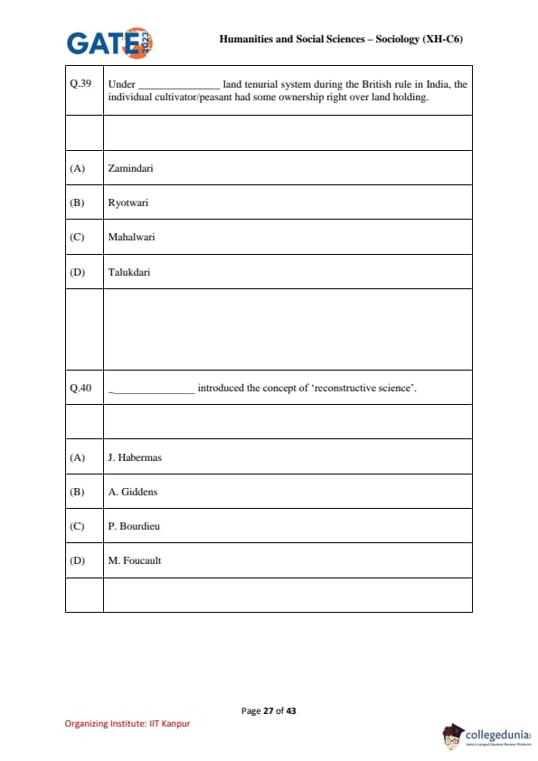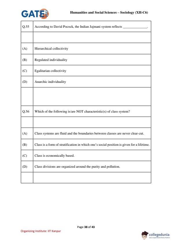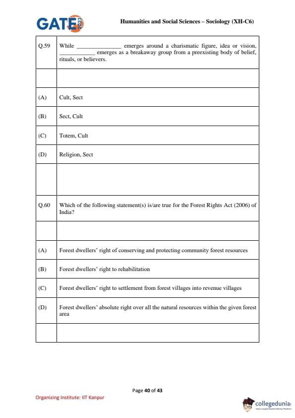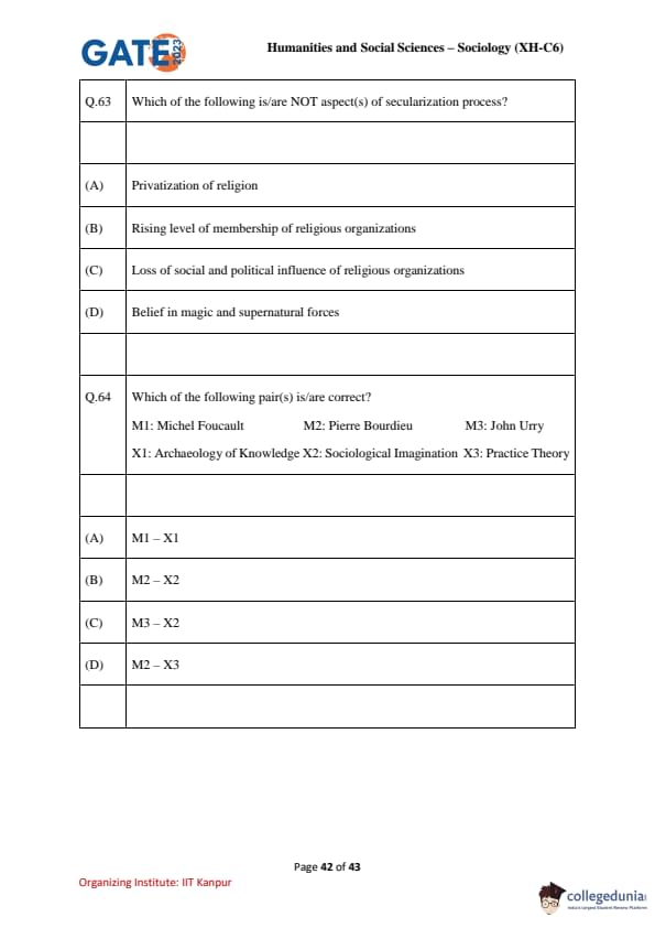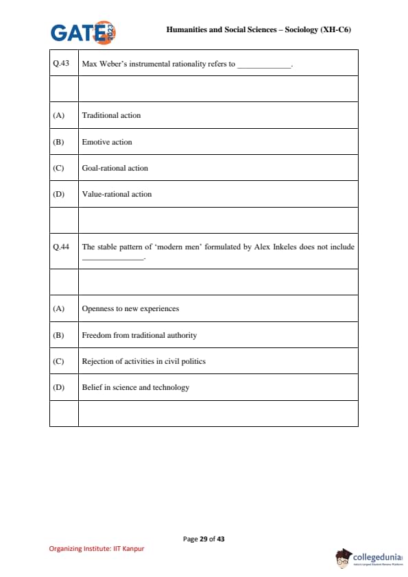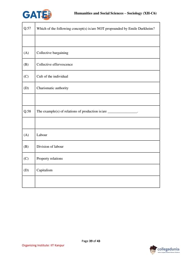 | GATE 2023 Humanities and Social Sciences – Sociology (XH-C6) Question Paper with Solutions | Check Solutions |