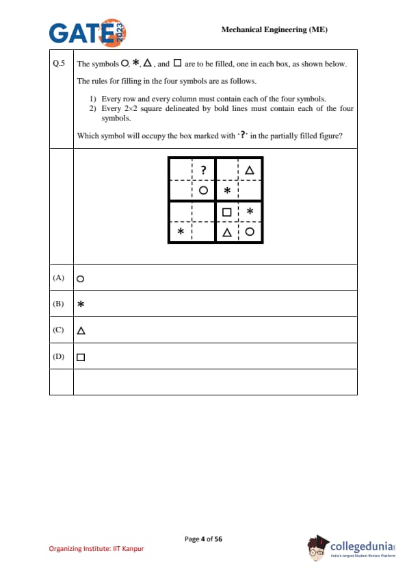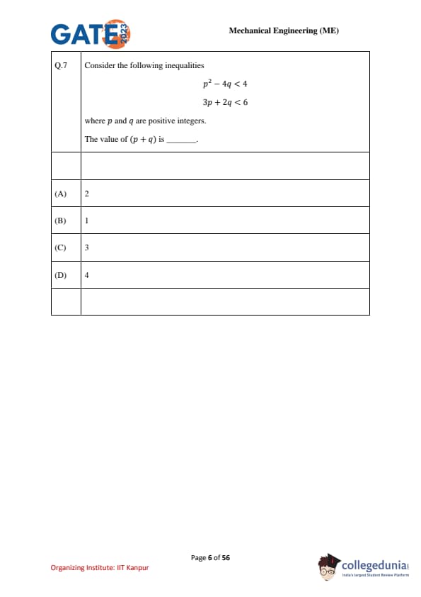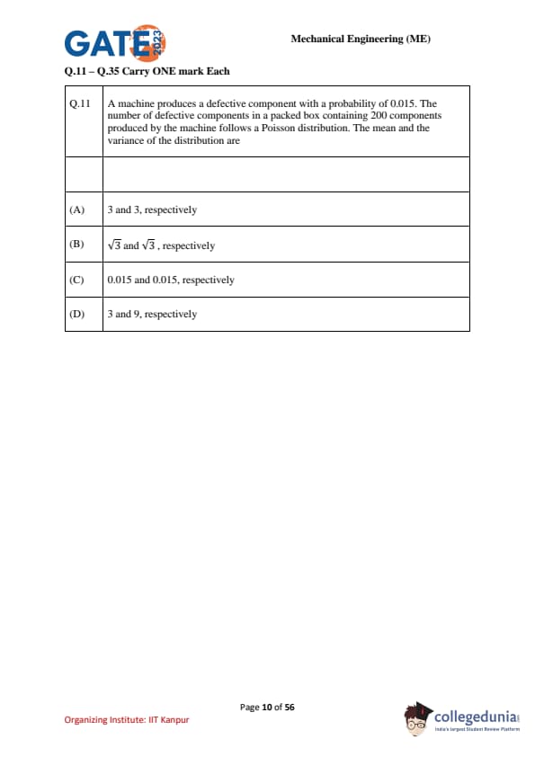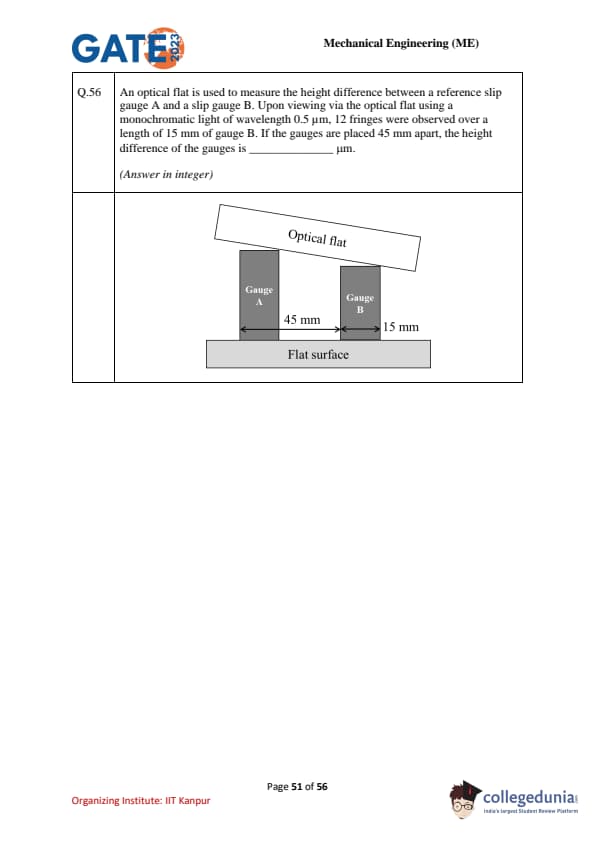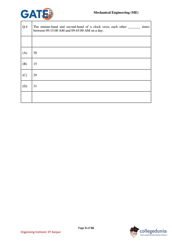 GATE 2023 Mechanical Engineering (ME) Question Paper is available here for download. IIT Kanpur conducted GATE 2023 Mechanical Engineering exam on February 4, 2023 in the Afternoon Session from 02:30 PM to 05:30 PM. Students reported GATE 2023 Question Paper to be moderate to tough in difficulty level. There were 30 MCQs, 8 MSQs and 27 NATs in GATE 2023 Mechanical paper carrying a weightage of 47 marks, 10 marks and 43 marks respectively.