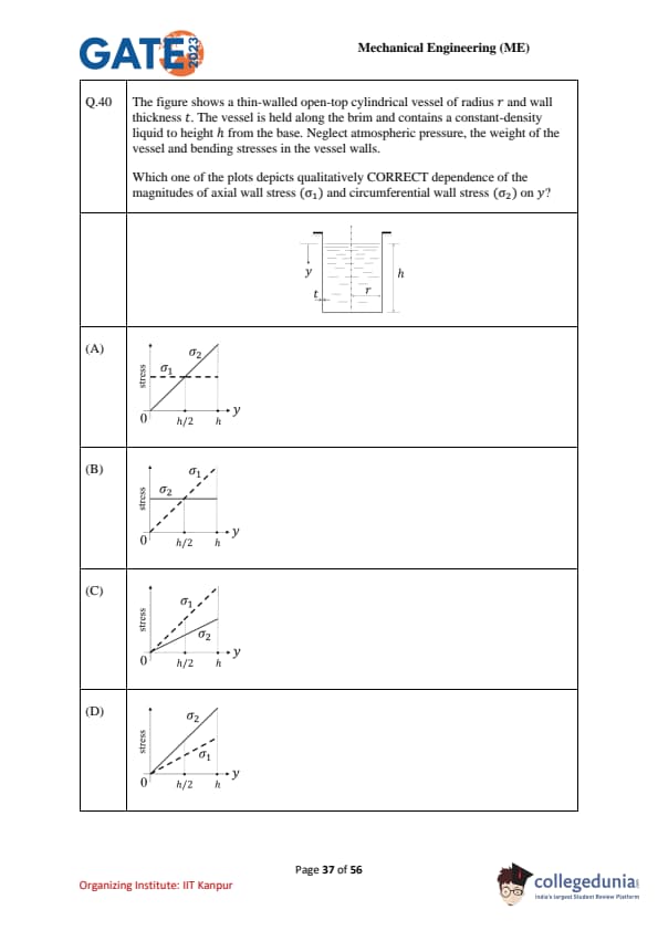 The figure shows a thin-walled open-top cylindrical vessel of radius \(r\) and wall thickness \(t\). The vessel is held along the brim and contains a constant-density liquid to height \(h\) from the base. Neglect atmospheric pressure, the weight of the vessel and bending stresses in the vessel walls. Which one of the plots depicts qualitatively CORRECT dependence of the magnitudes of axial wall stress (\(\sigma_1\)) and circumferential wall stress (\(\sigma_2\)) on \(y\)?