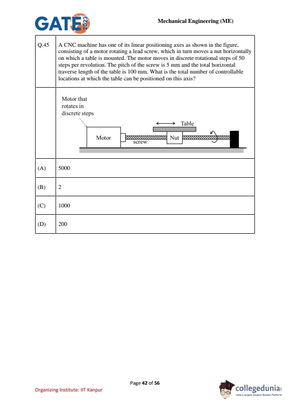 A CNC machine has one of its linear positioning axes as shown in the figure, consisting of a motor rotating a lead screw, which in turn moves a nut horizontally on which a table is mounted. The motor moves in discrete rotational steps of 50 steps per revolution. The pitch of the screw is 5 mm and the total horizontal traverse length of the table is 100 mm. What is the total number of controllable locations at which the table can be positioned on this axis?