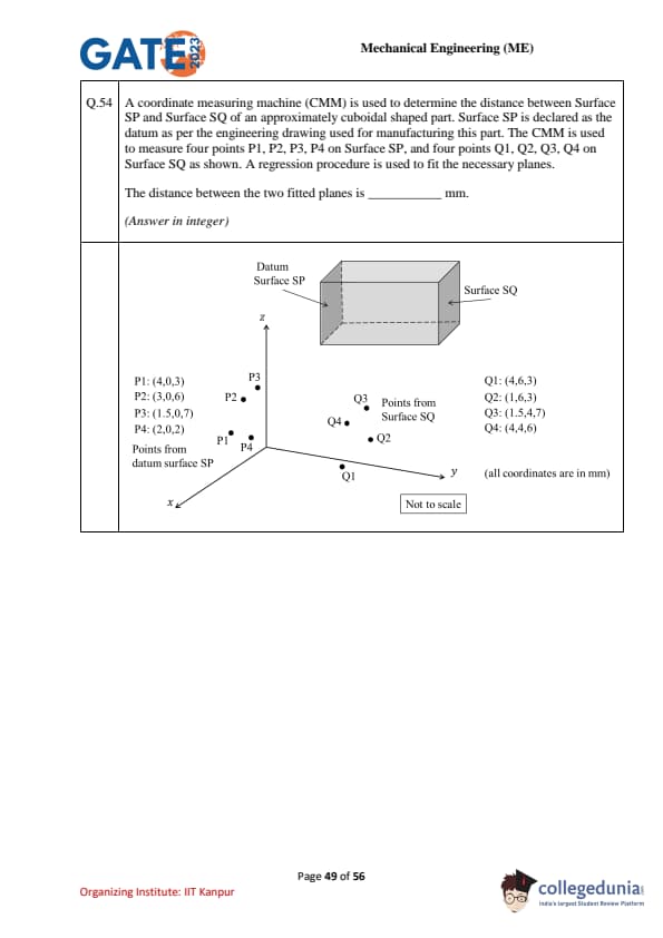 A coordinate measuring machine (CMM) is used to determine the distance between Surface SP and Surface SQ of an approximately cuboidal shaped part. Surface SP is declared as the datum as per the engineering drawing used for manufacturing this part. The CMM is used to measure four points P1, P2, P3, P4 on Surface SP, and four points Q1, Q2, Q3, Q4 on Surface SQ as shown. A regression procedure is used to fit the necessary planes. The distance between the two fitted planes is ________________ mm. (Answer in integer)