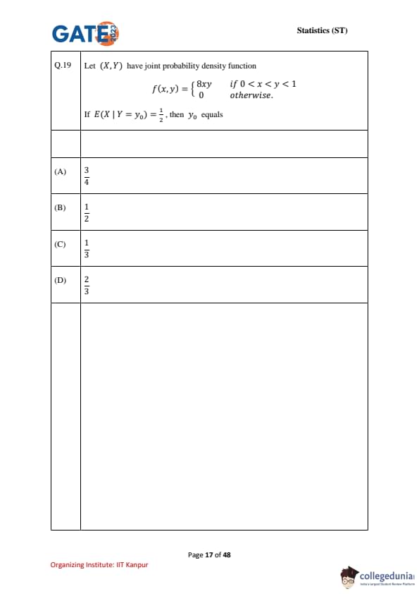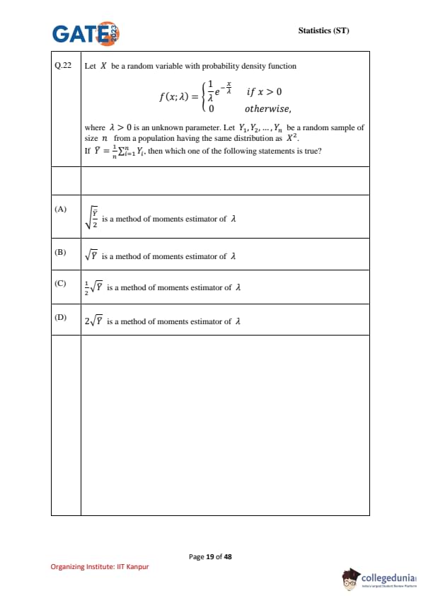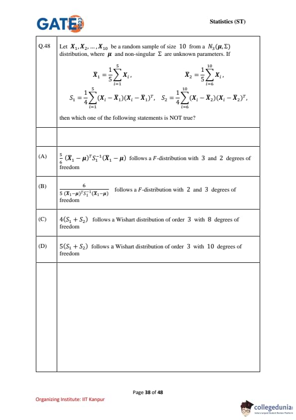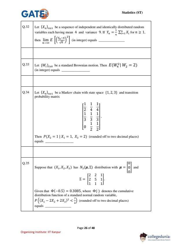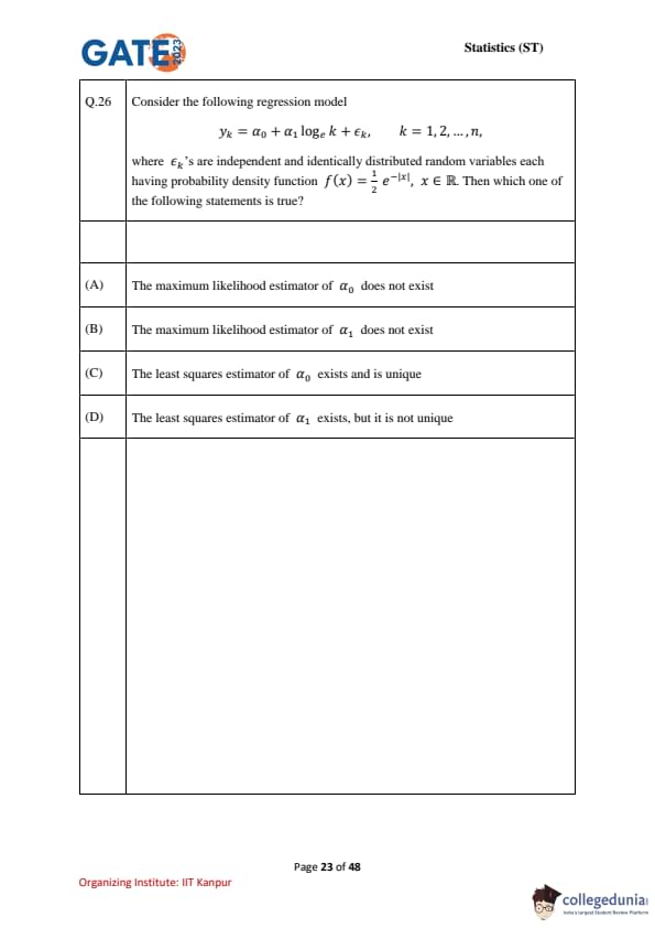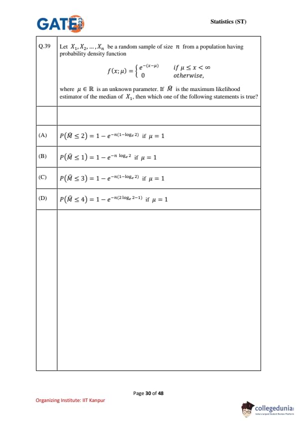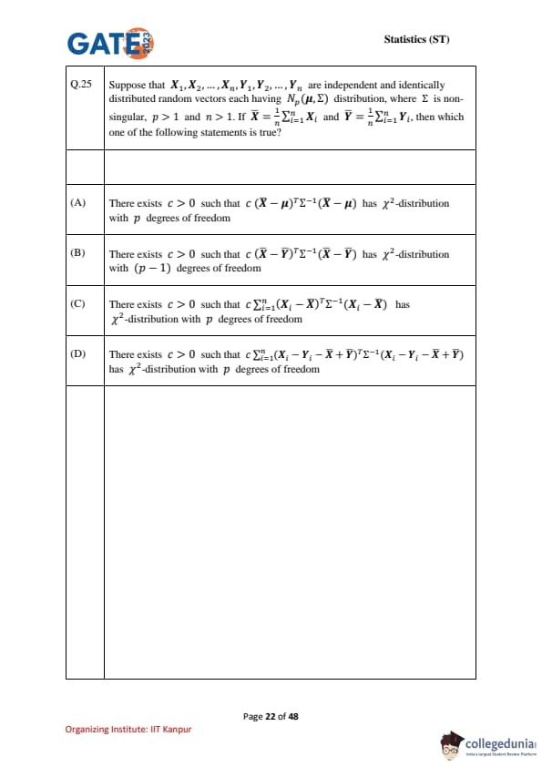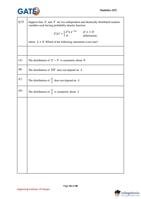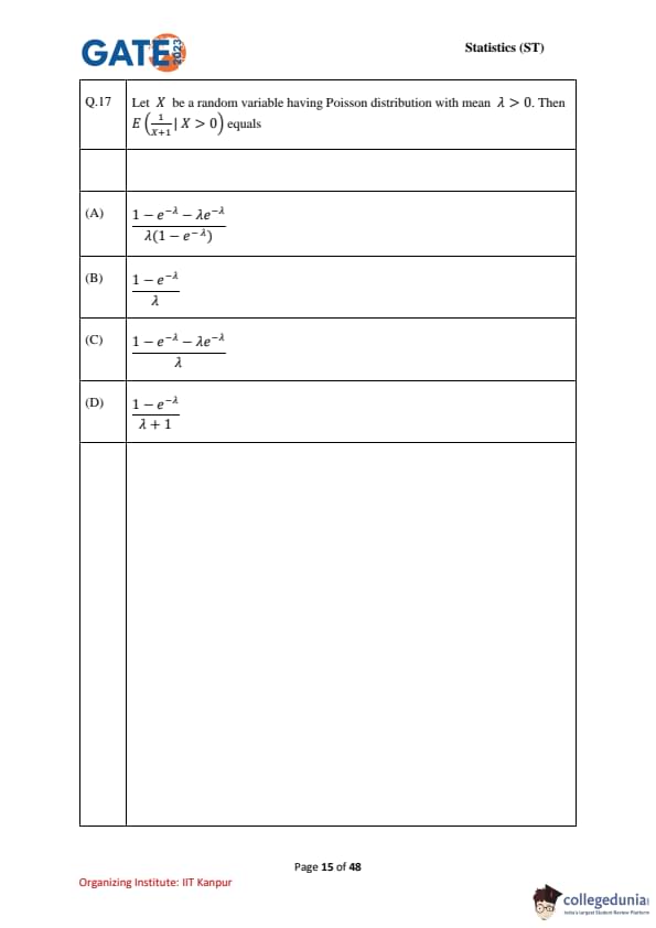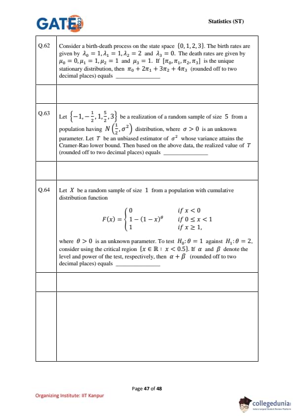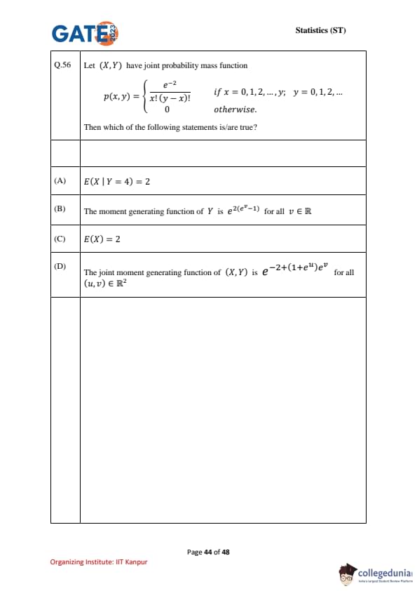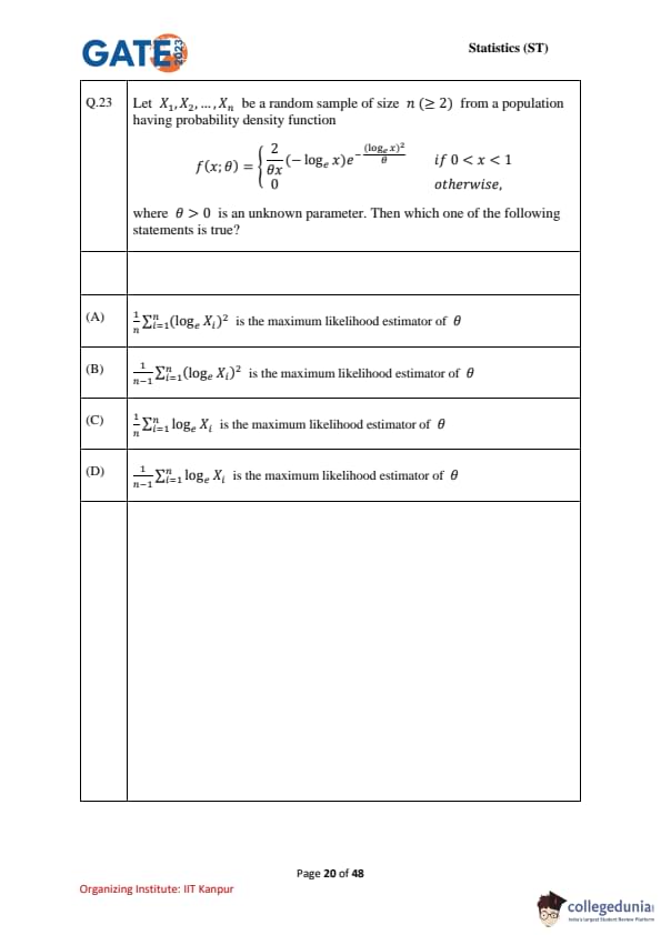 | GATE 2023 Statistics (ST) Question Paper with Solutions | Check Solutions |