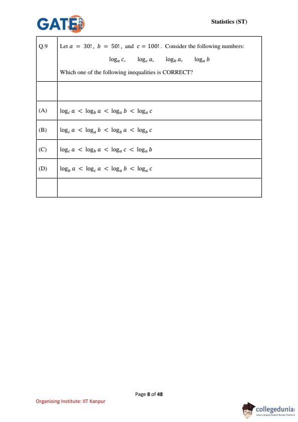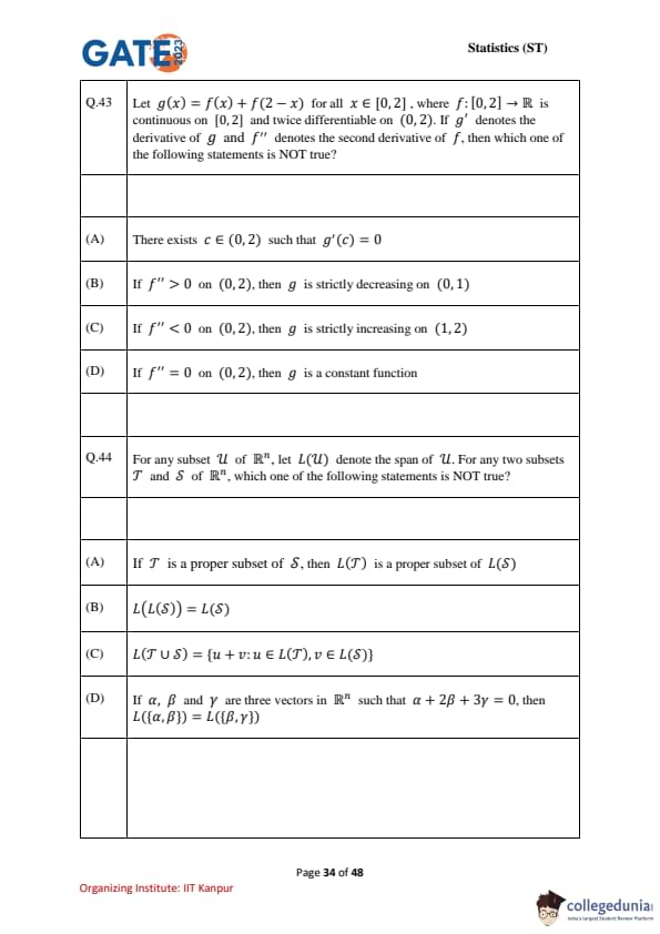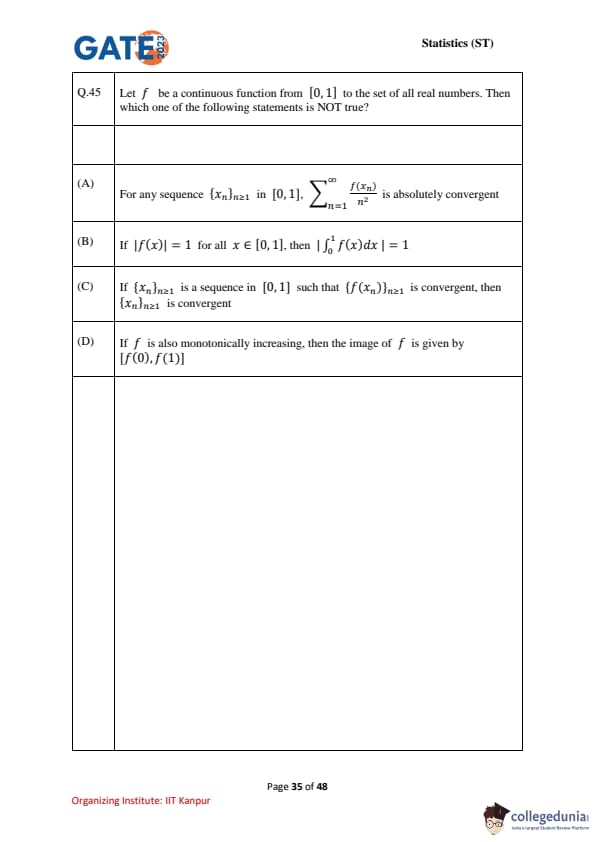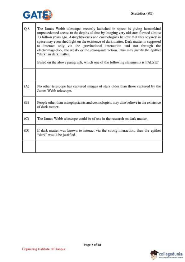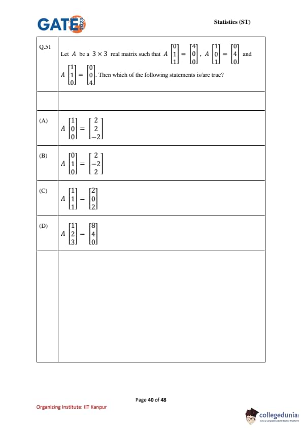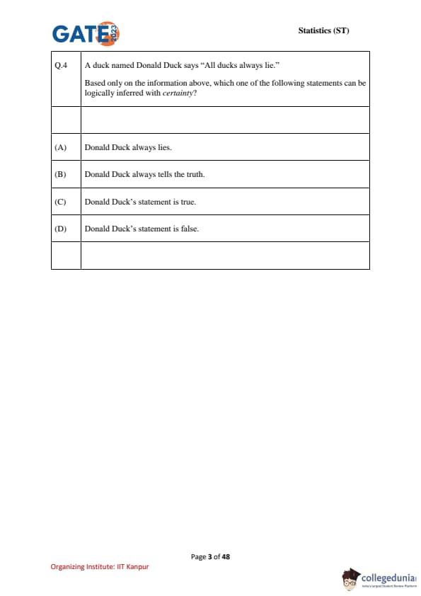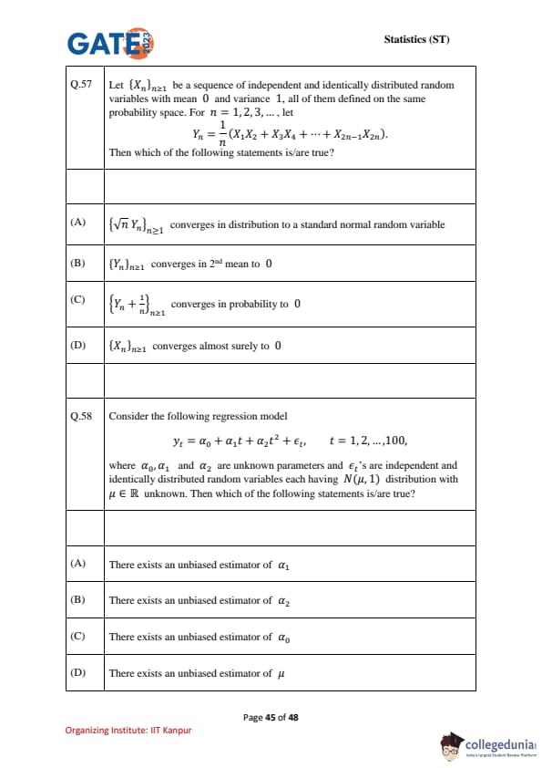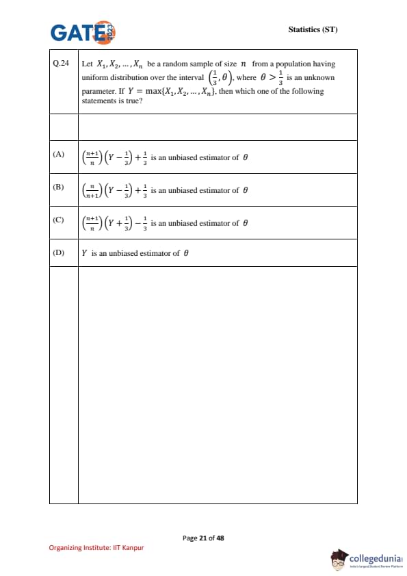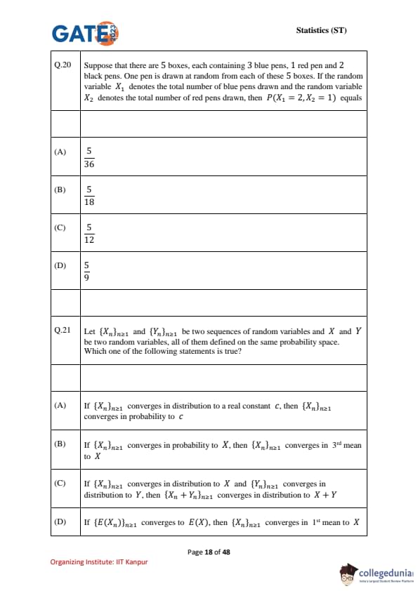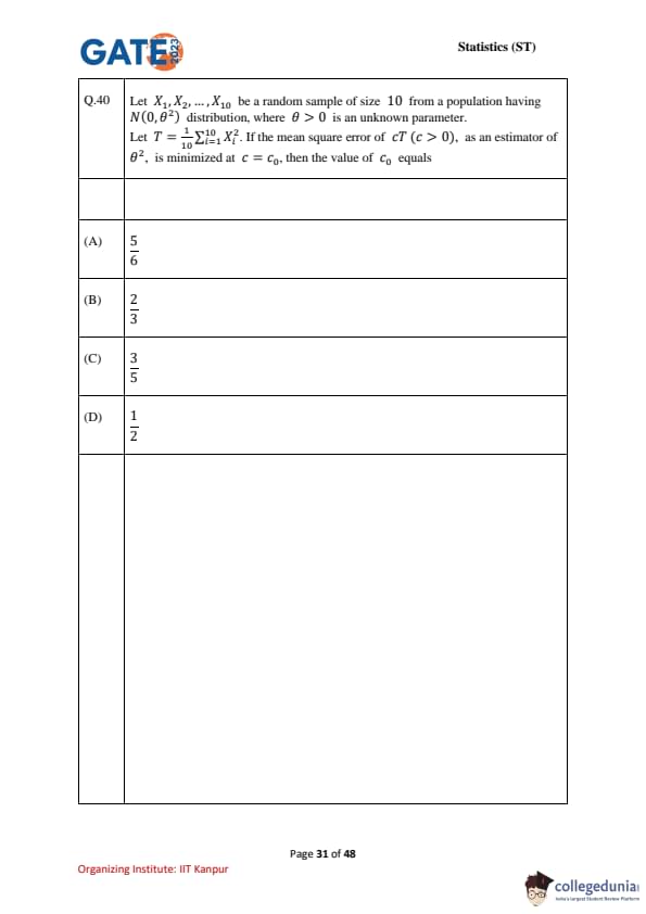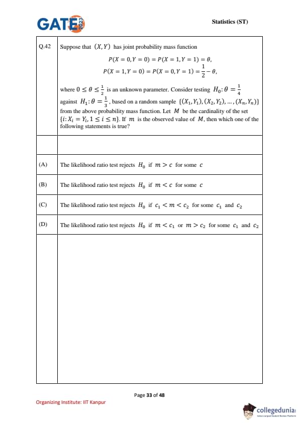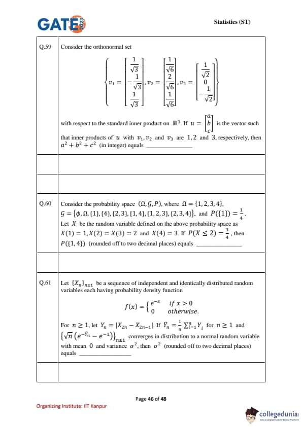 | GATE 2023 Statistics (ST) Question Paper with Solutions | Check Solutions |