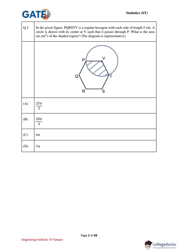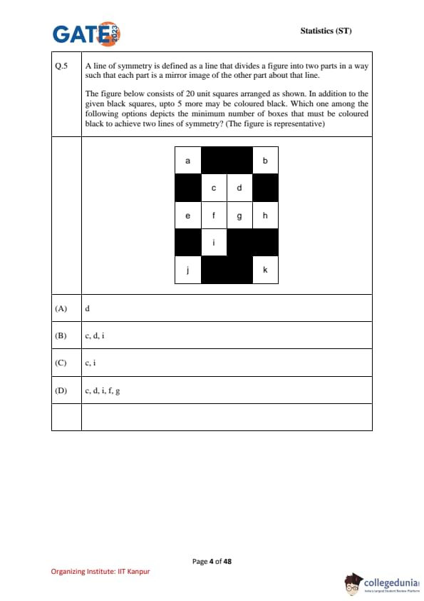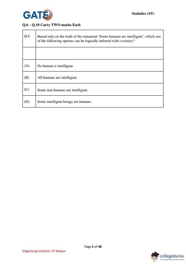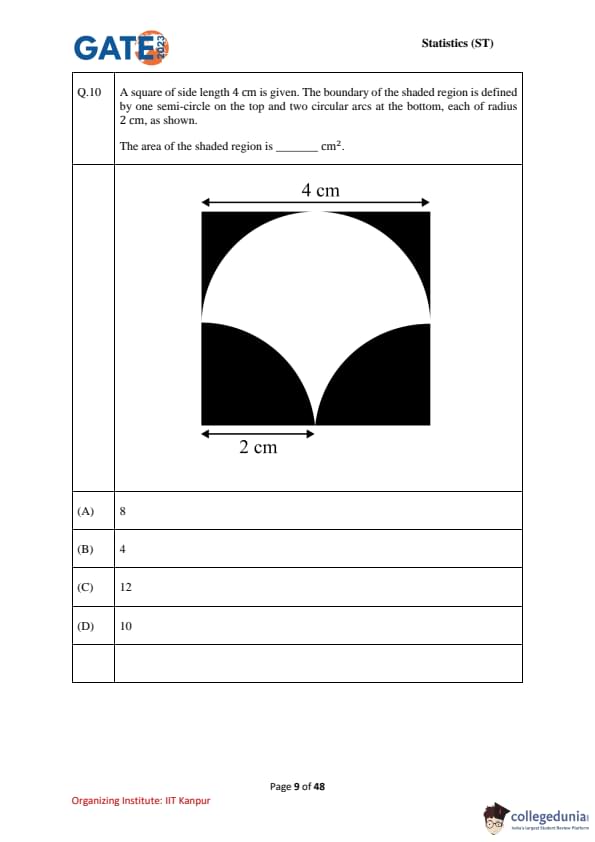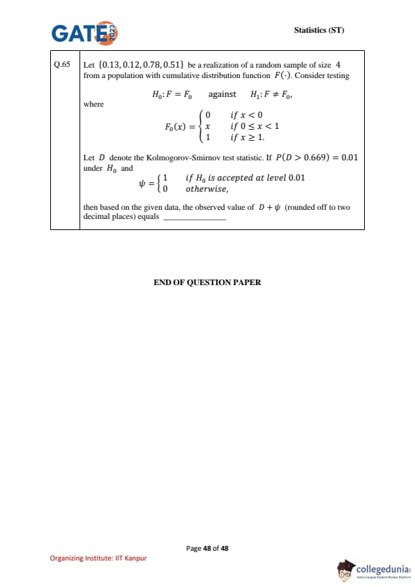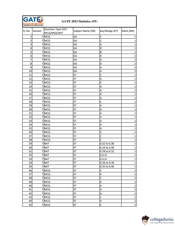 GATE 2023 Statistics (ST) Question Paper PDF is available here for download. IIT Kanpur conducted GATE 2023 Statistics exam on February 12, 2023 in the Forenoon Session from 09:30 AM to 12:30 PM. Students have to answer 65 questions in GATE 2023 Statistics Question Paper carrying a total weightage of 100 marks. 10 questions are from the General Aptitude section and 55 questions are from Engineering Mathematics and Core Discipline.