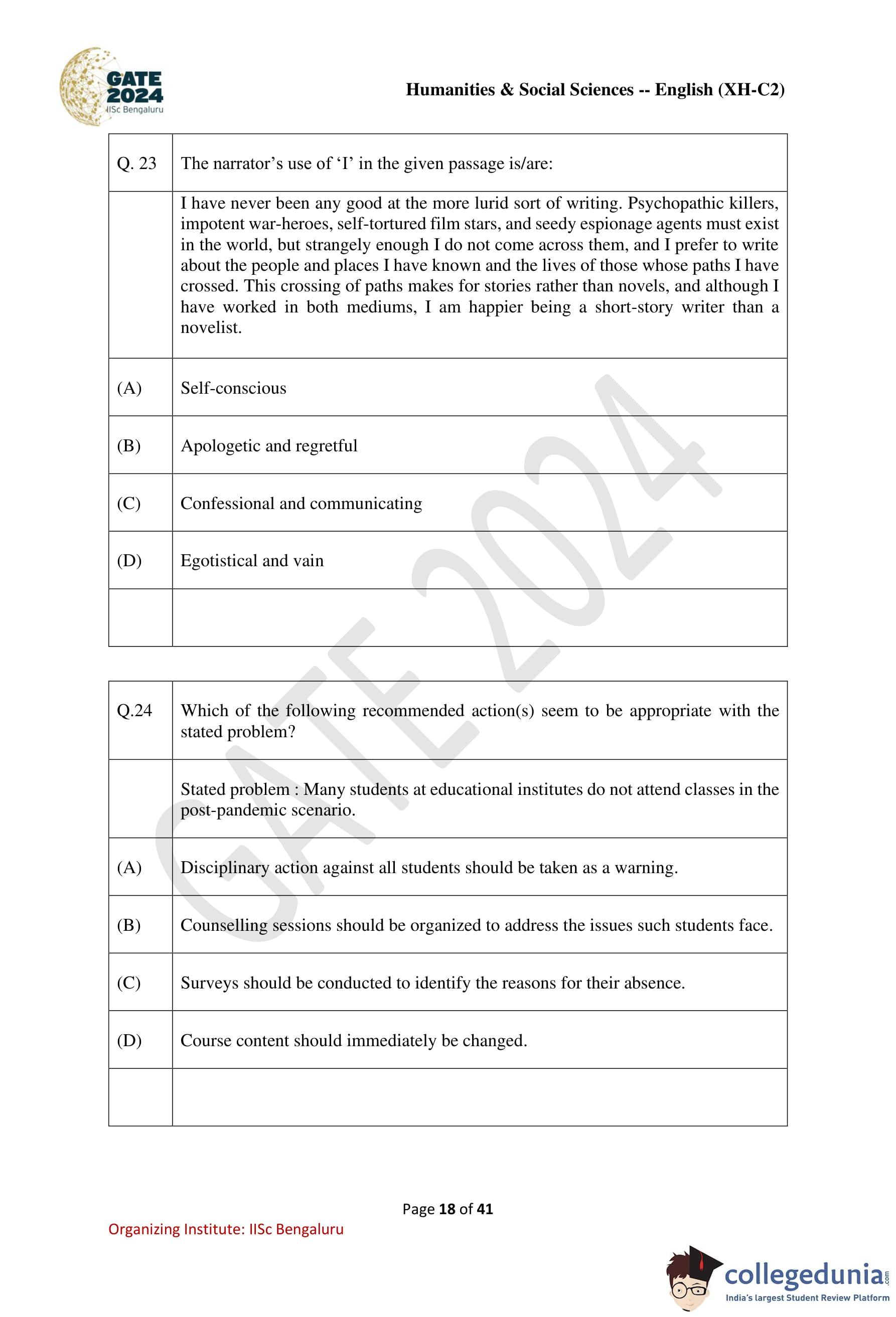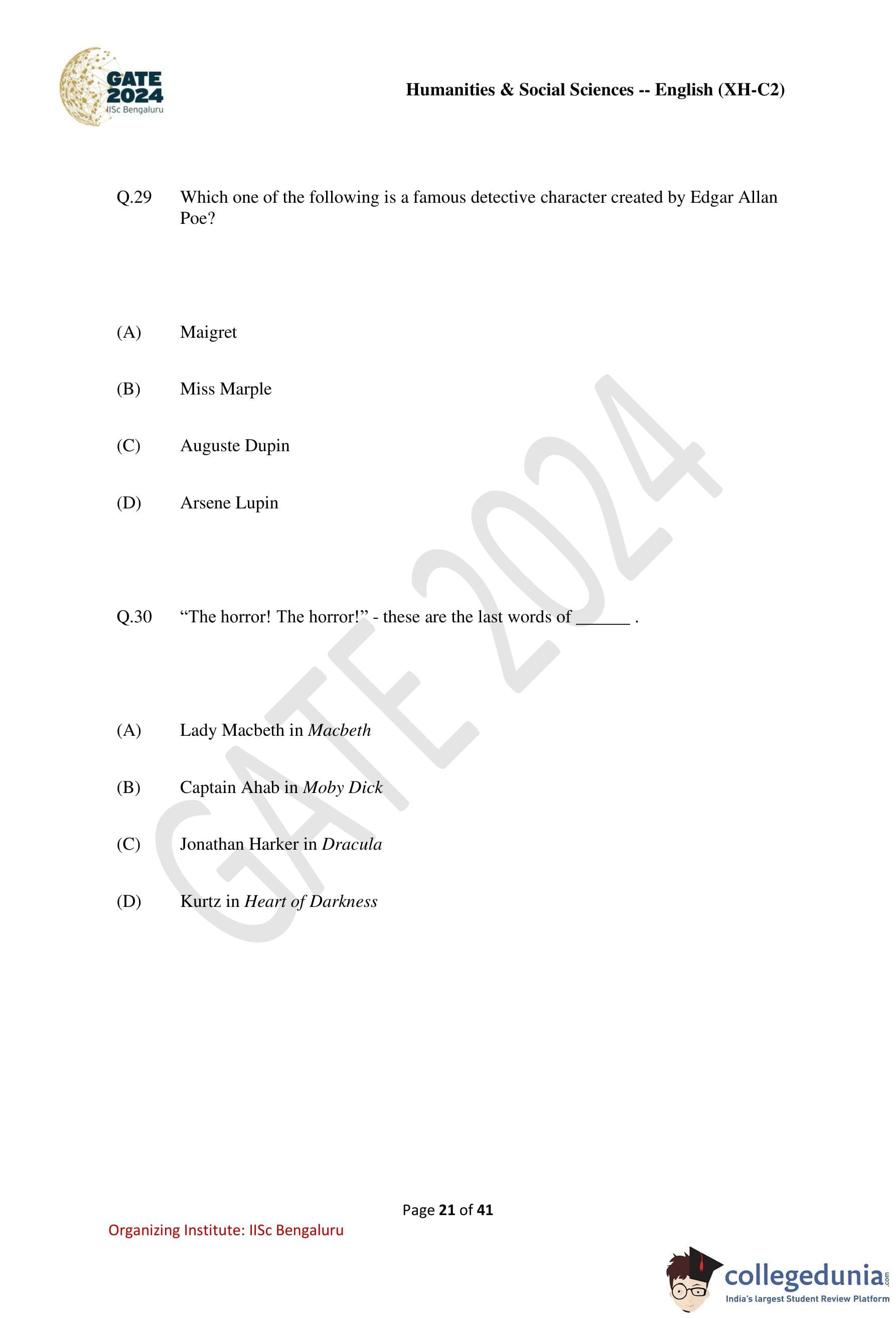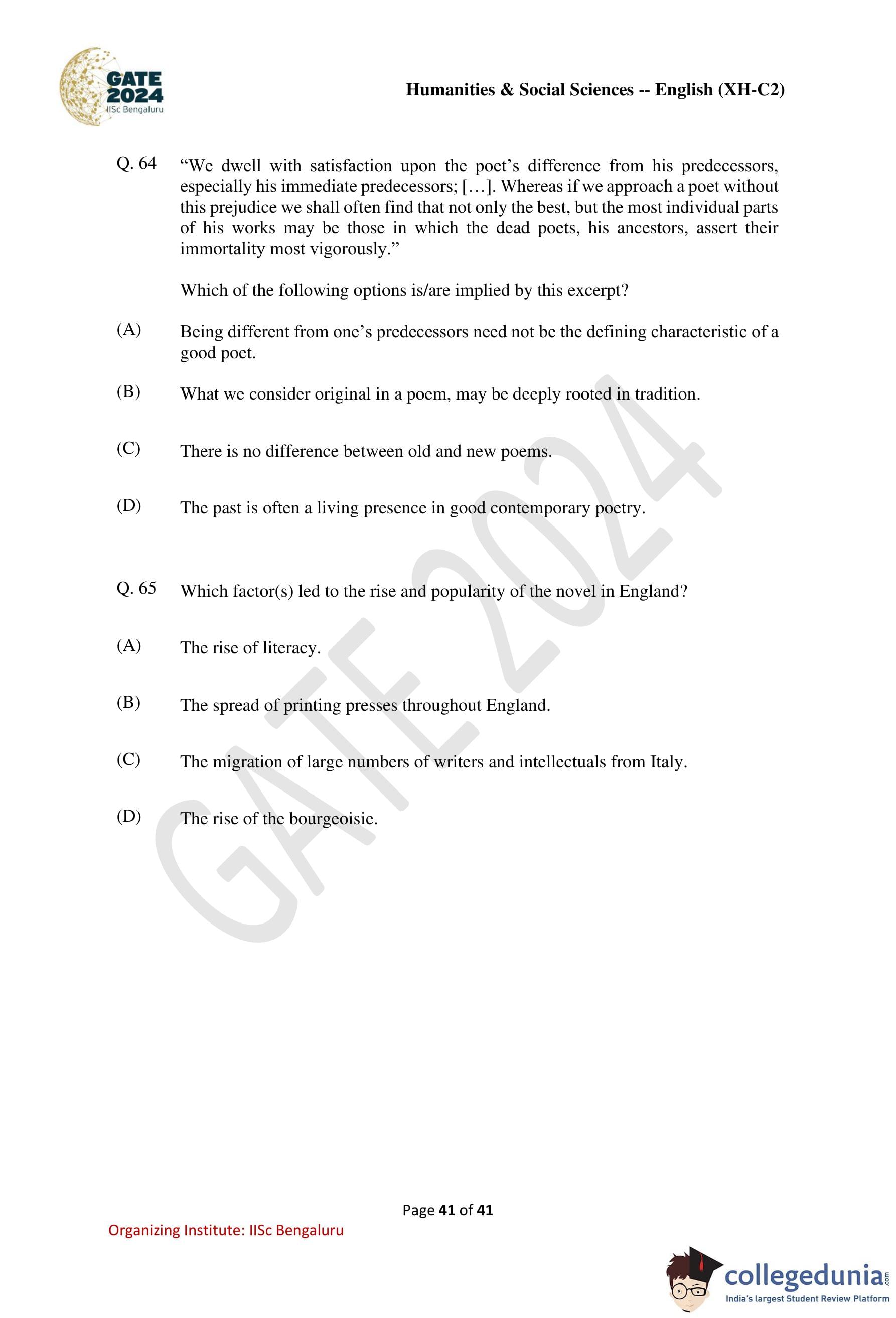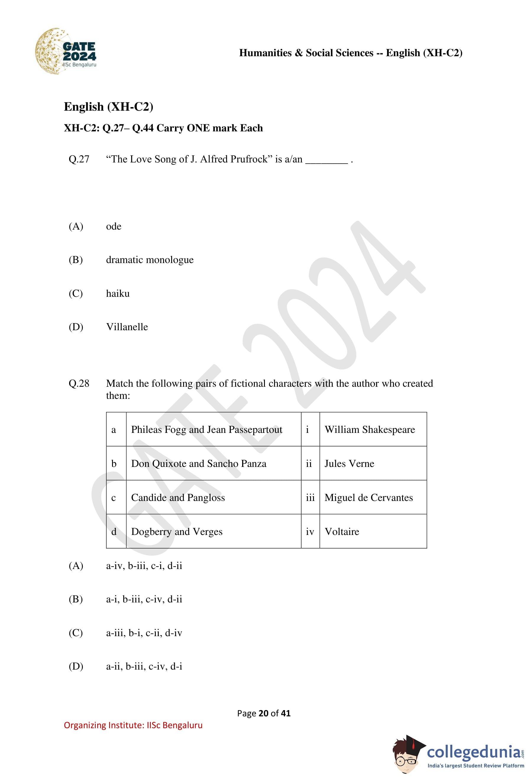 GATE 2024 English (XH-C2) Question Paper PDF is available here. IISc Banglore conducted GATE 2024 English (XH-C2) exam on February 4 in the Forenoon Session from 9:30 AM to 12:30 PM. Students have to answer 65 questions in GATE 2024 English (XH-C2) Question Paper carrying a total weightage of 100 marks. 10 questions are from the General Aptitude section and 55 questions are from Core Discipline.