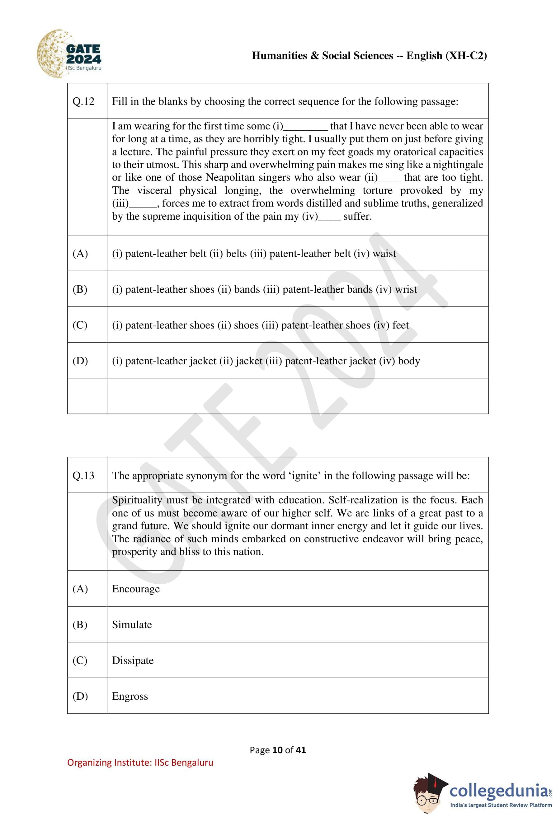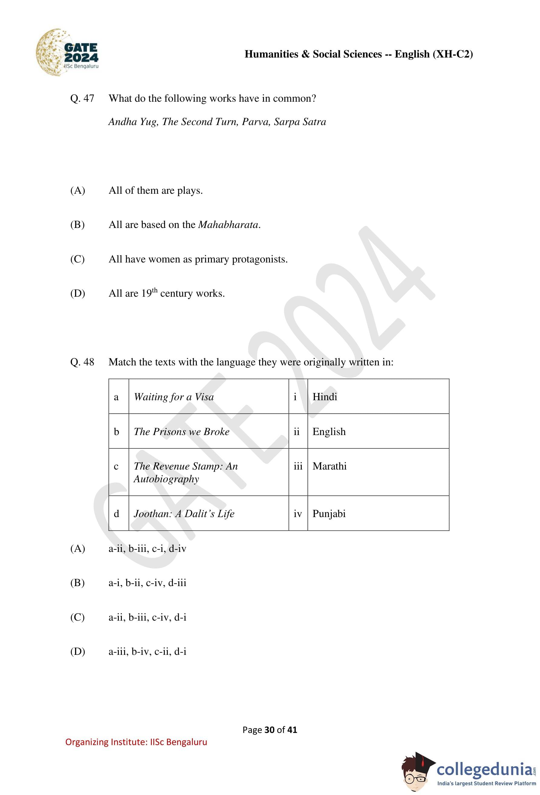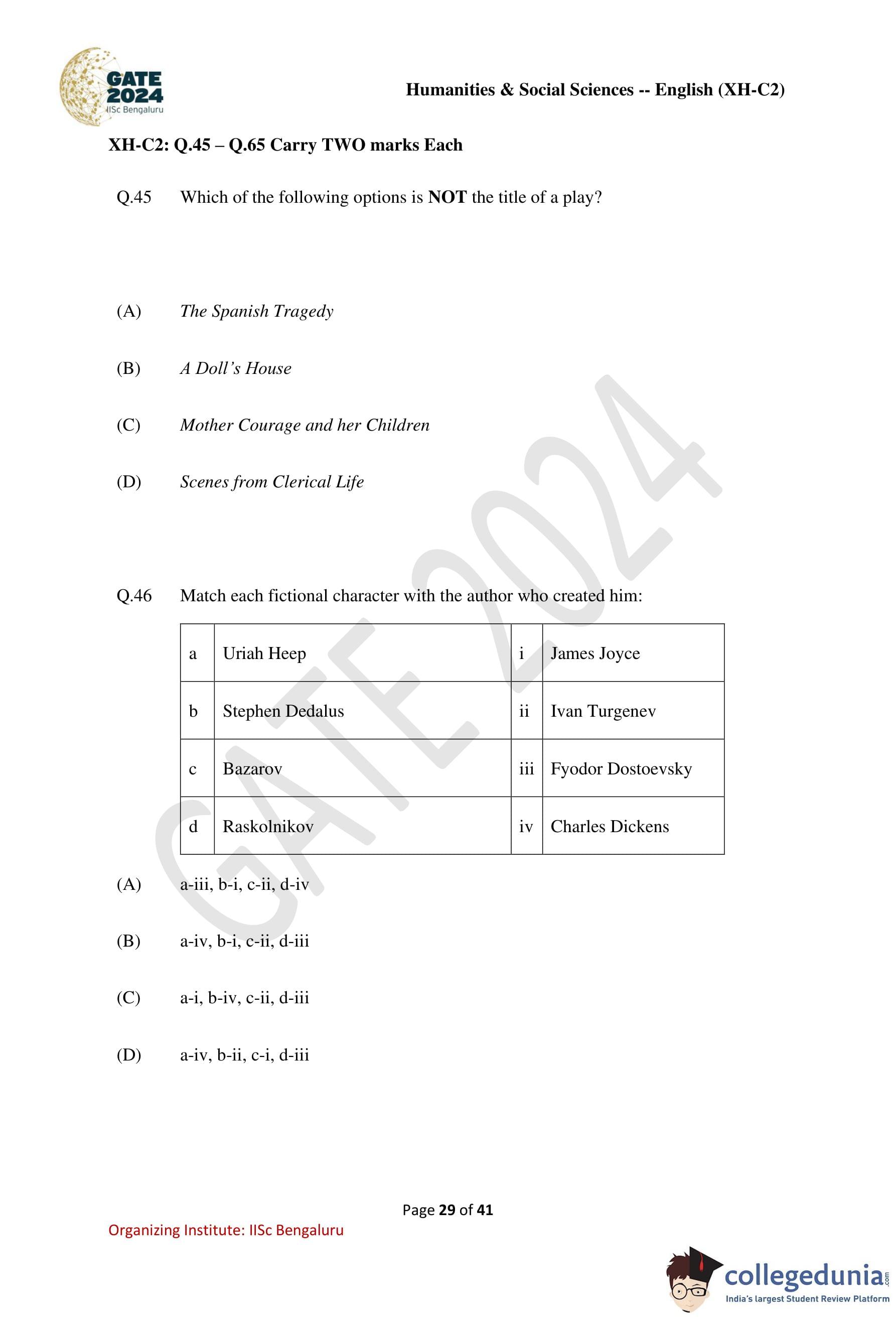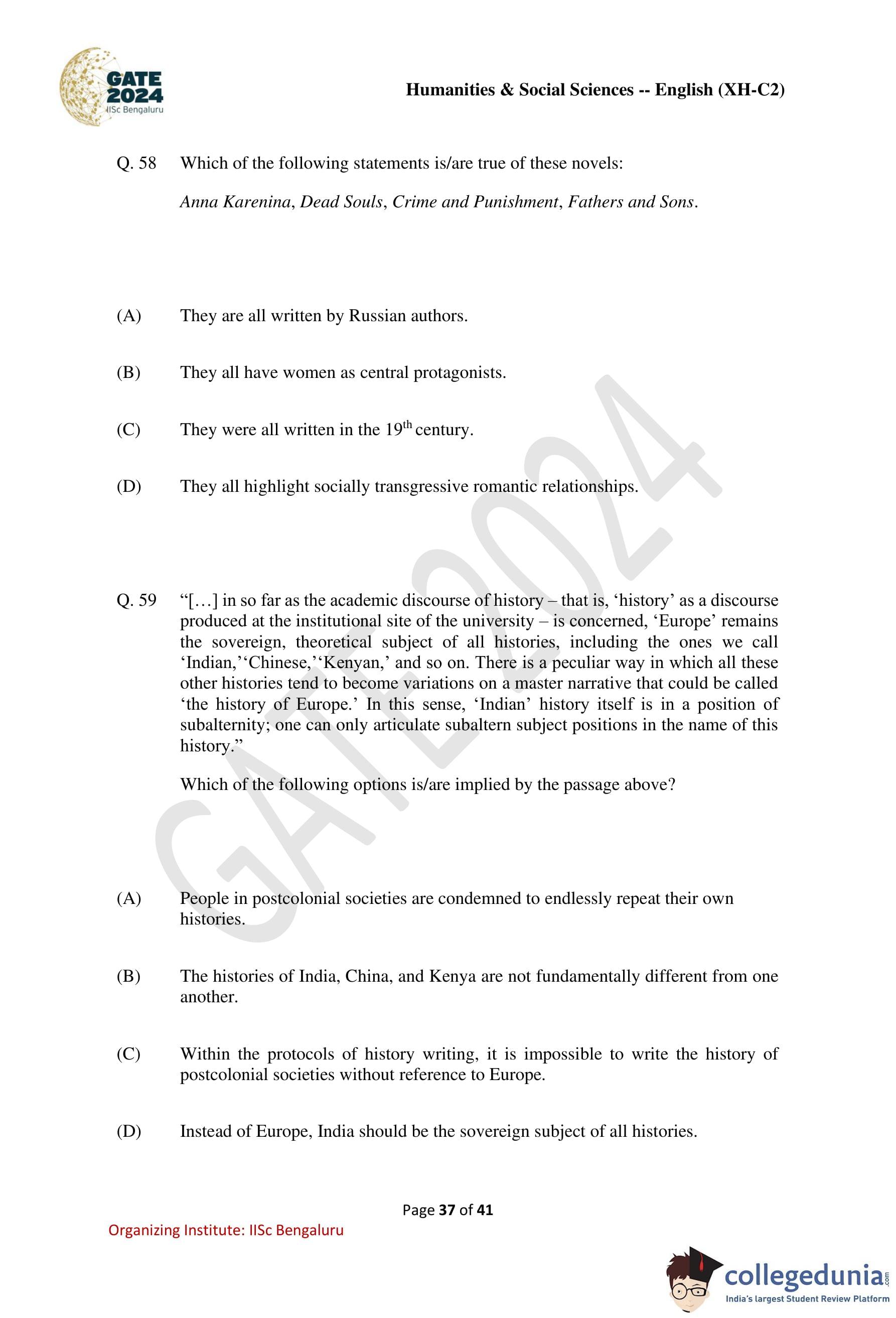 GATE 2024 English (XH-C2) Question Paper PDF is available here. IISc Banglore conducted GATE 2024 English (XH-C2) exam on February 4 in the Forenoon Session from 9:30 AM to 12:30 PM. Students have to answer 65 questions in GATE 2024 English (XH-C2) Question Paper carrying a total weightage of 100 marks. 10 questions are from the General Aptitude section and 55 questions are from Core Discipline.