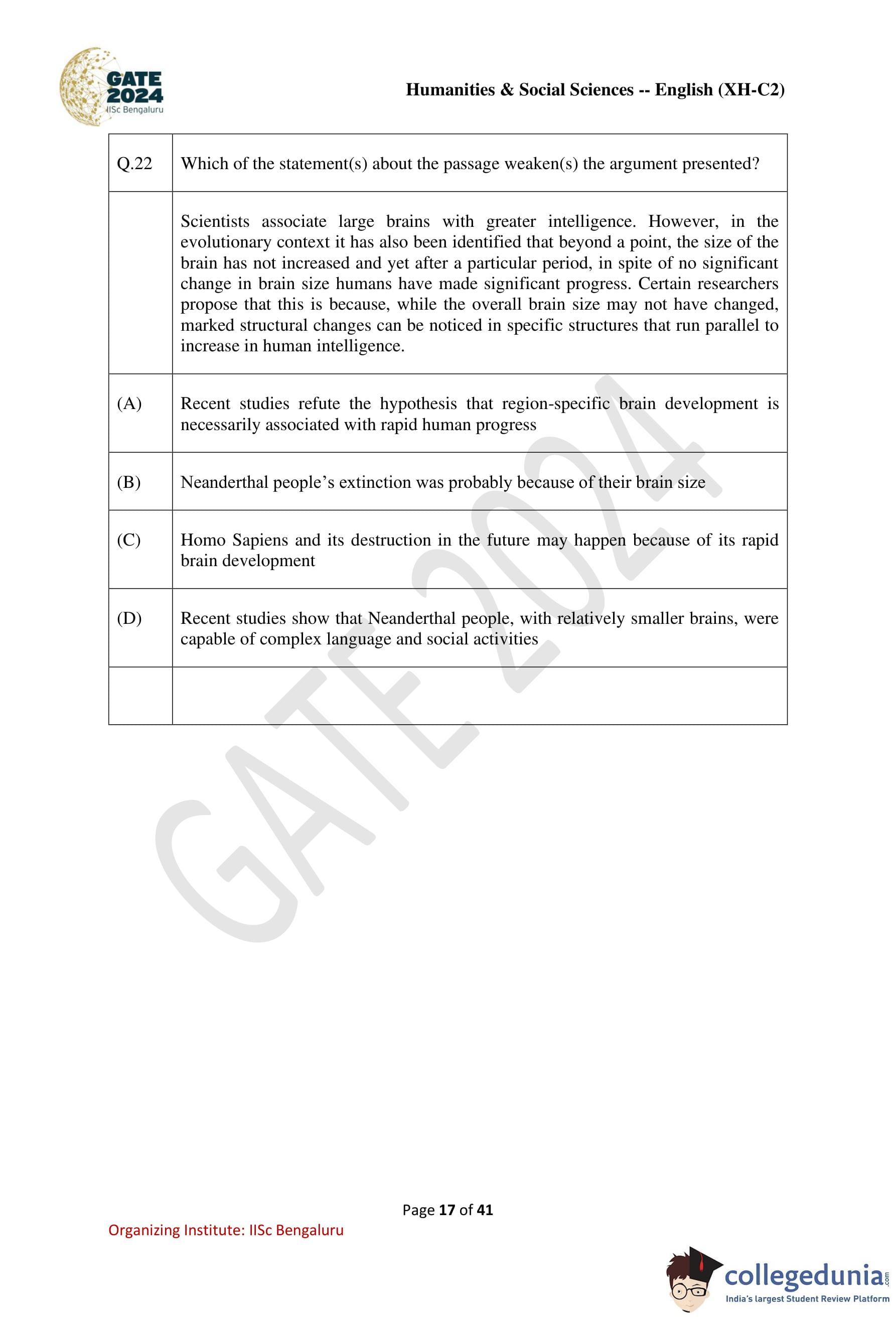 | 22 | Which statement weakens the argument that brain size does not directly correlate with intelligence? (A) Recent studies refute the hypothesis... (B) Neanderthal people’s extinction... (C) Homo Sapiens destruction... (D) Neanderthal people, with smaller brains... | (A) Recent studies refute... | Solution: Option (A) weakens the argument by challenging the claim that region-specific brain development correlates with progress, directly refuting the presented hypothesis. |