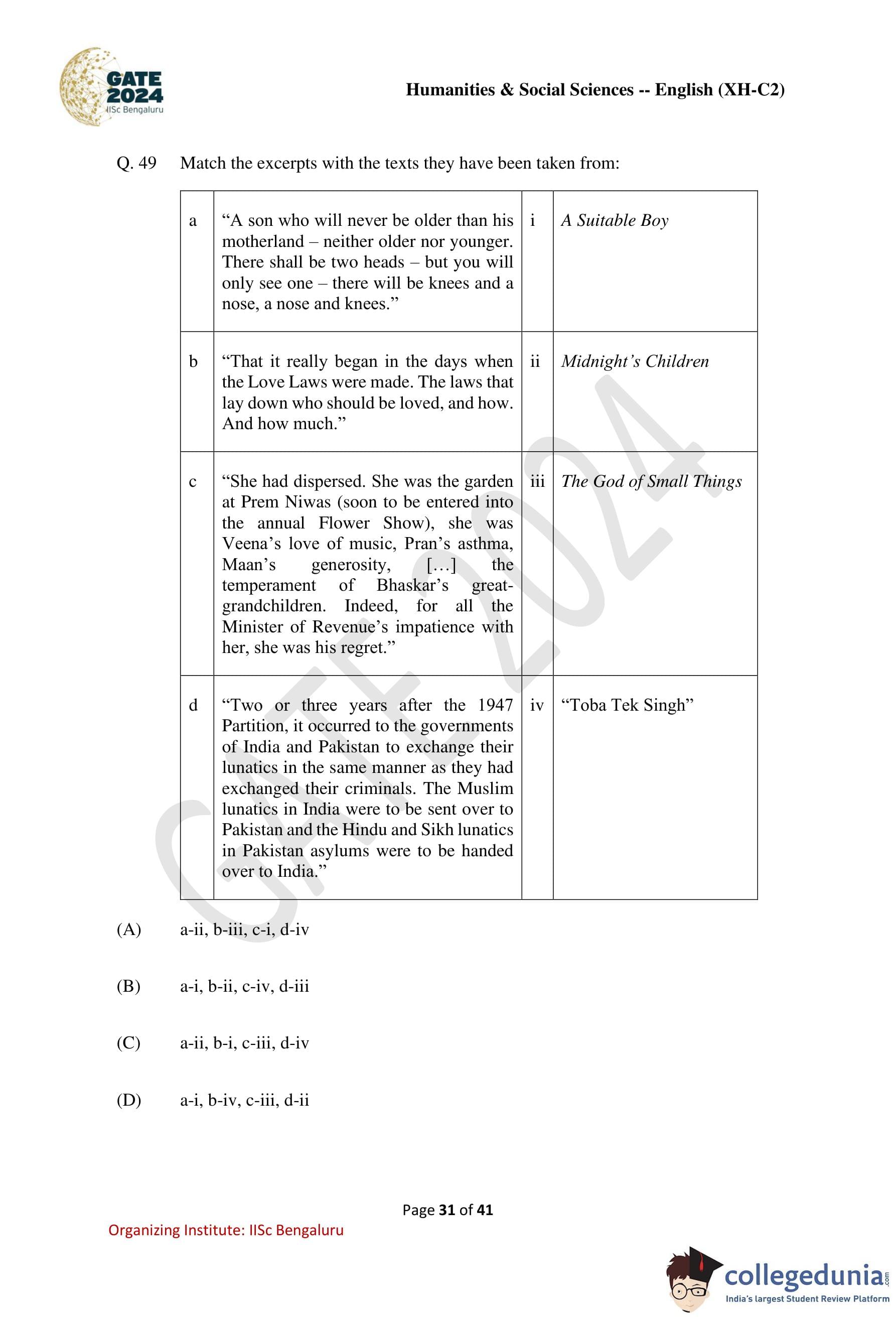 | 15 | Match the excerpts with the texts they have been taken from: a) “A son who will never be older than his motherland…” b) “That it really began in the days when the Love Laws were made…” c) “She had dispersed. She was the garden at Prem Niwas…” d) “Two or three years after the 1947 Partition…” | (A) a-ii, b-iii, c-i, d-iv | Matches: a) "Midnight’s Children," b) "The God of Small Things," c) "A Suitable Boy," d) "Toba Tek Singh." |