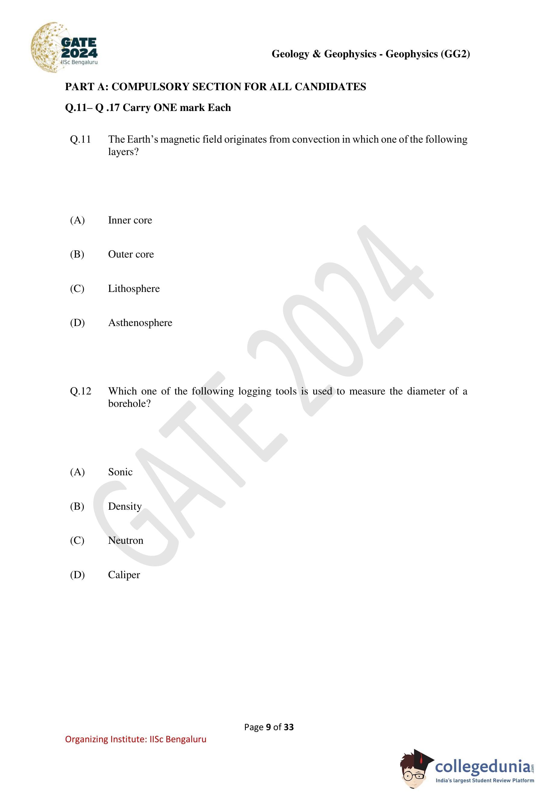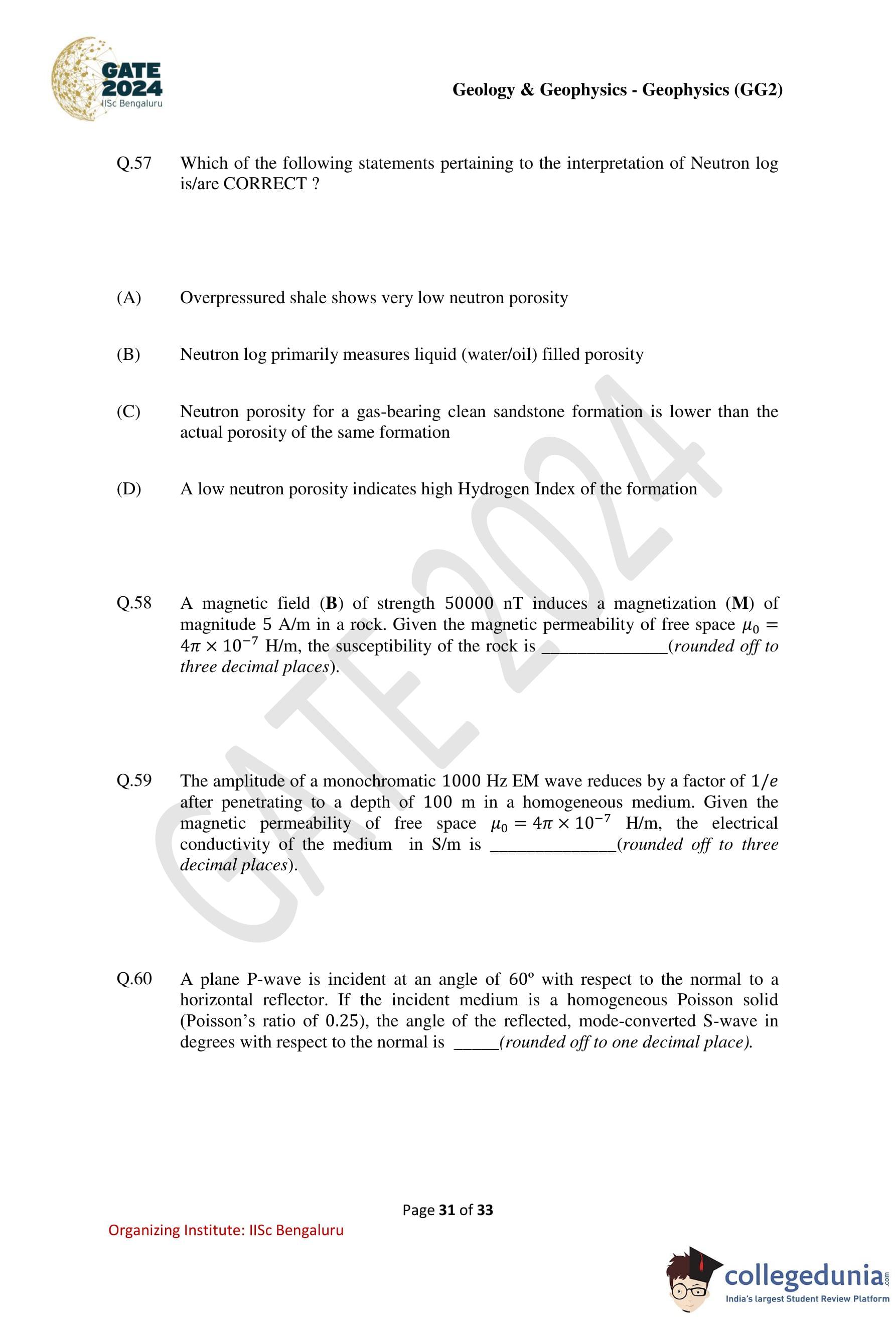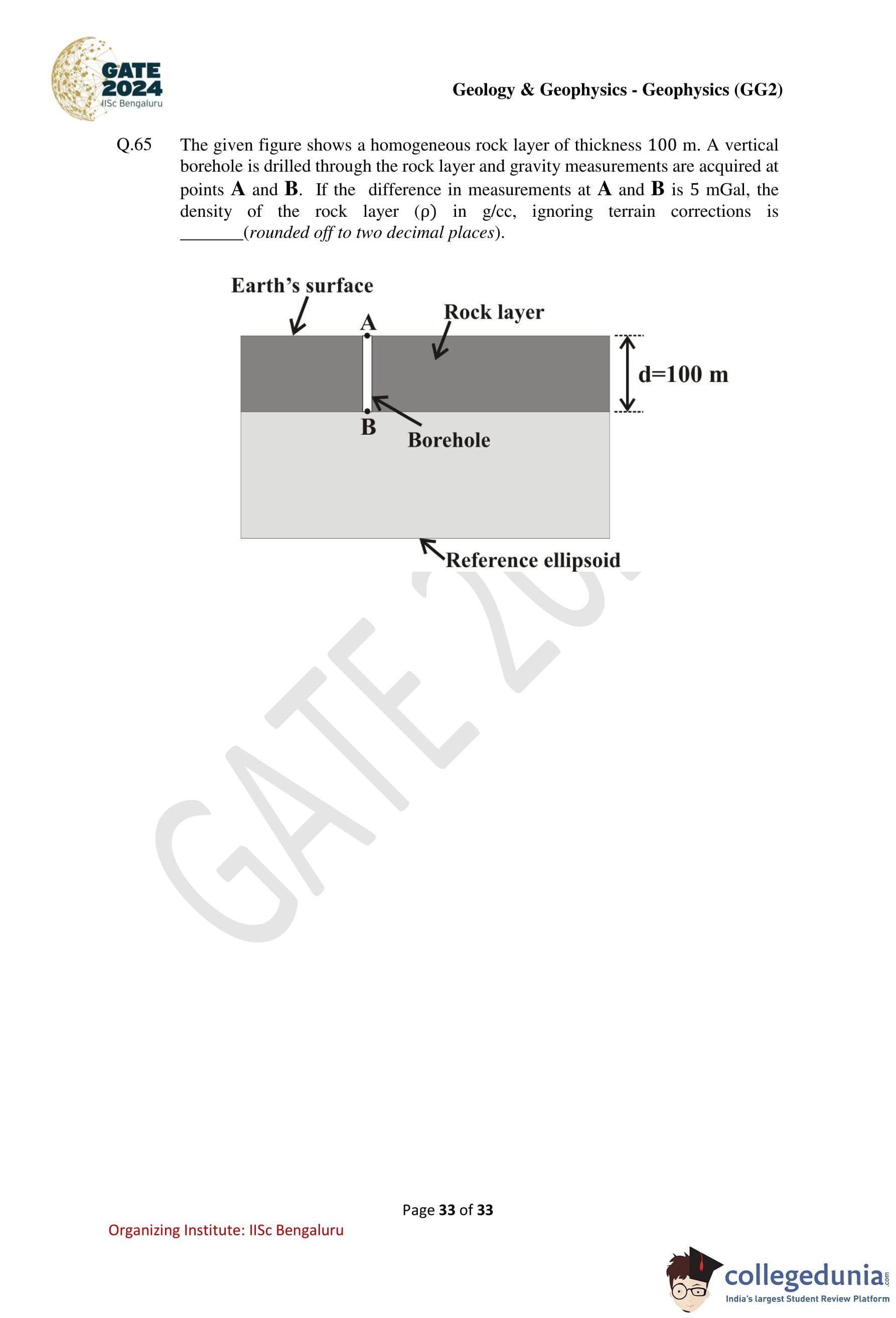 GATE 2024 Geophysics Question Paper PDF is available here. IISc Banglore conducted GATE 2024 Geophysics exam on February 4 in the Forenoon Session from 9:30 AM to 12:30 PM. Students have to answer 65 questions in GATE 2024 Geophysics Question Paper carrying a total weightage of 100 marks. 10 questions are from the General Aptitude section and 55 questions are from Core Discipline.