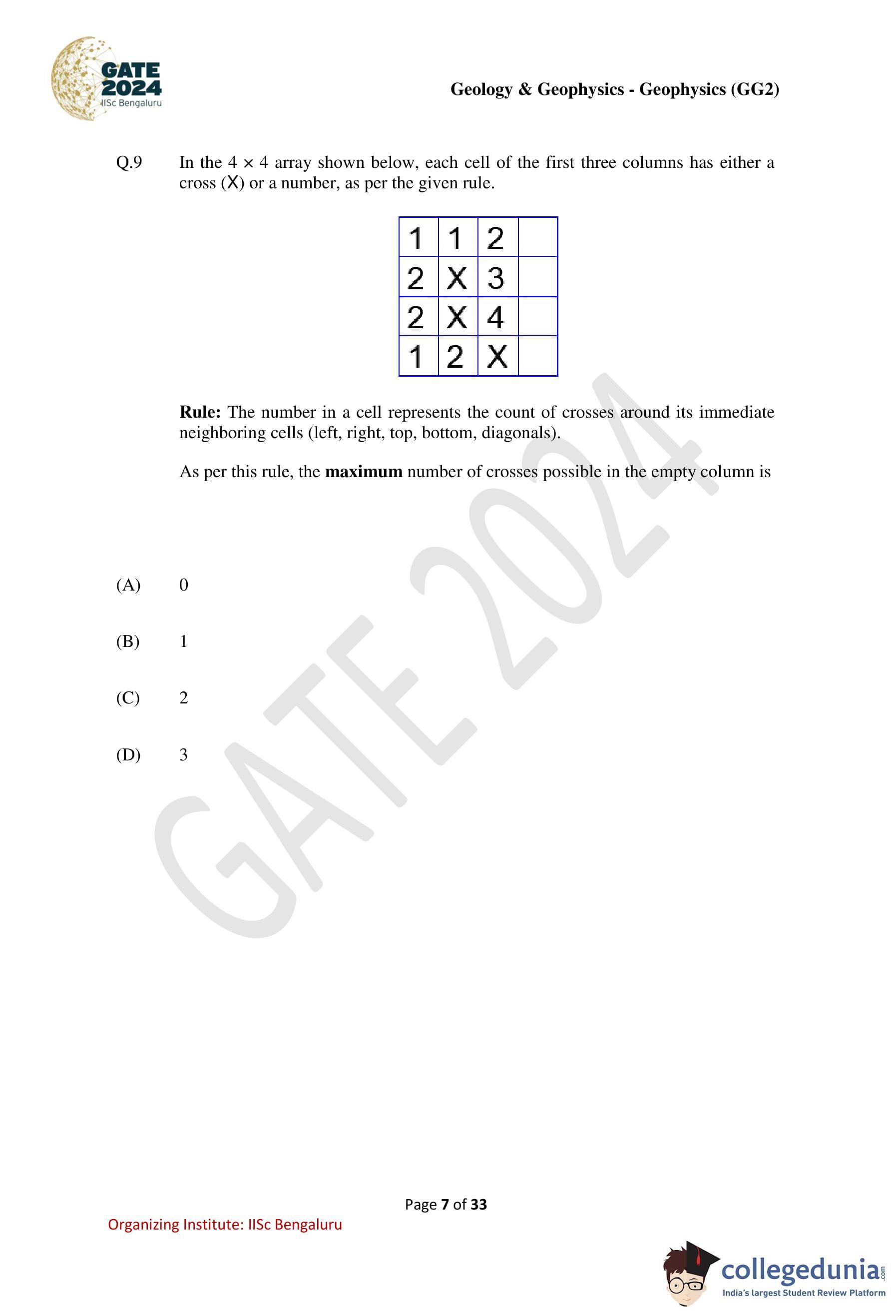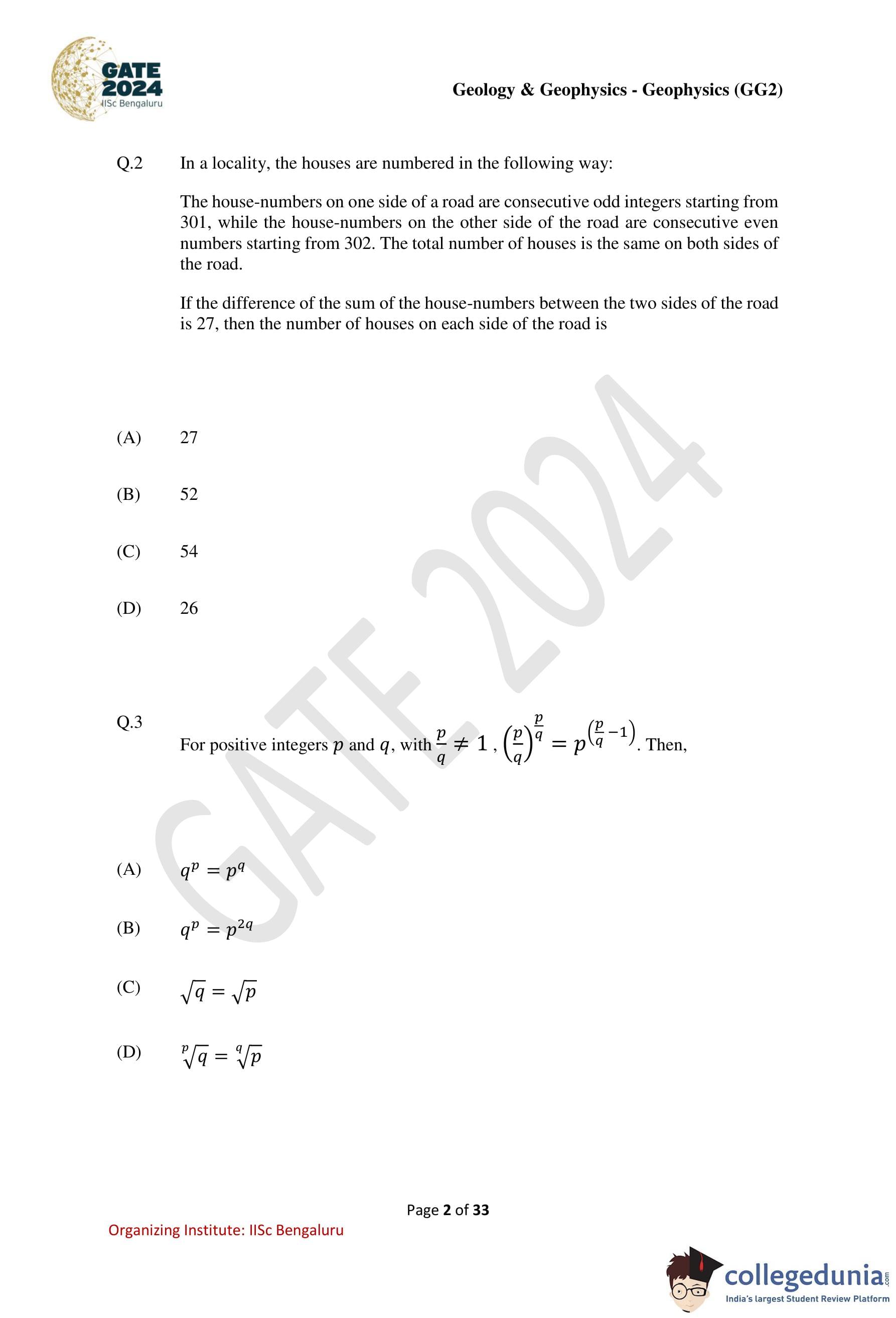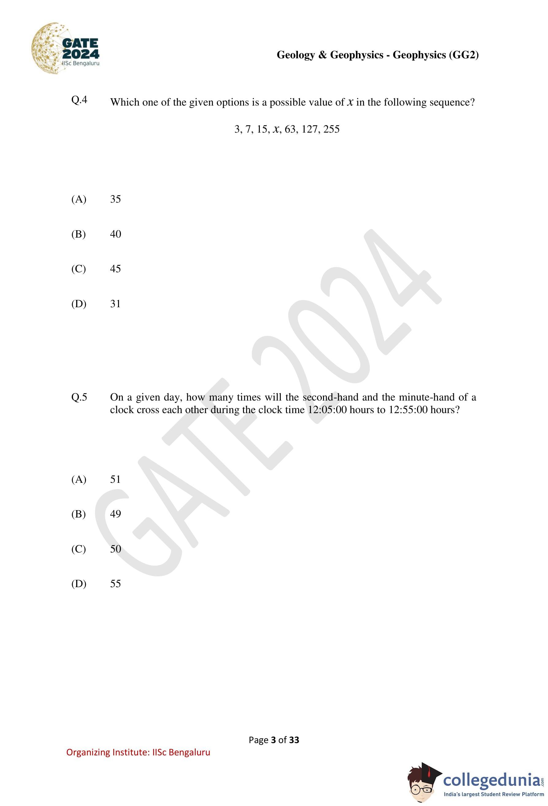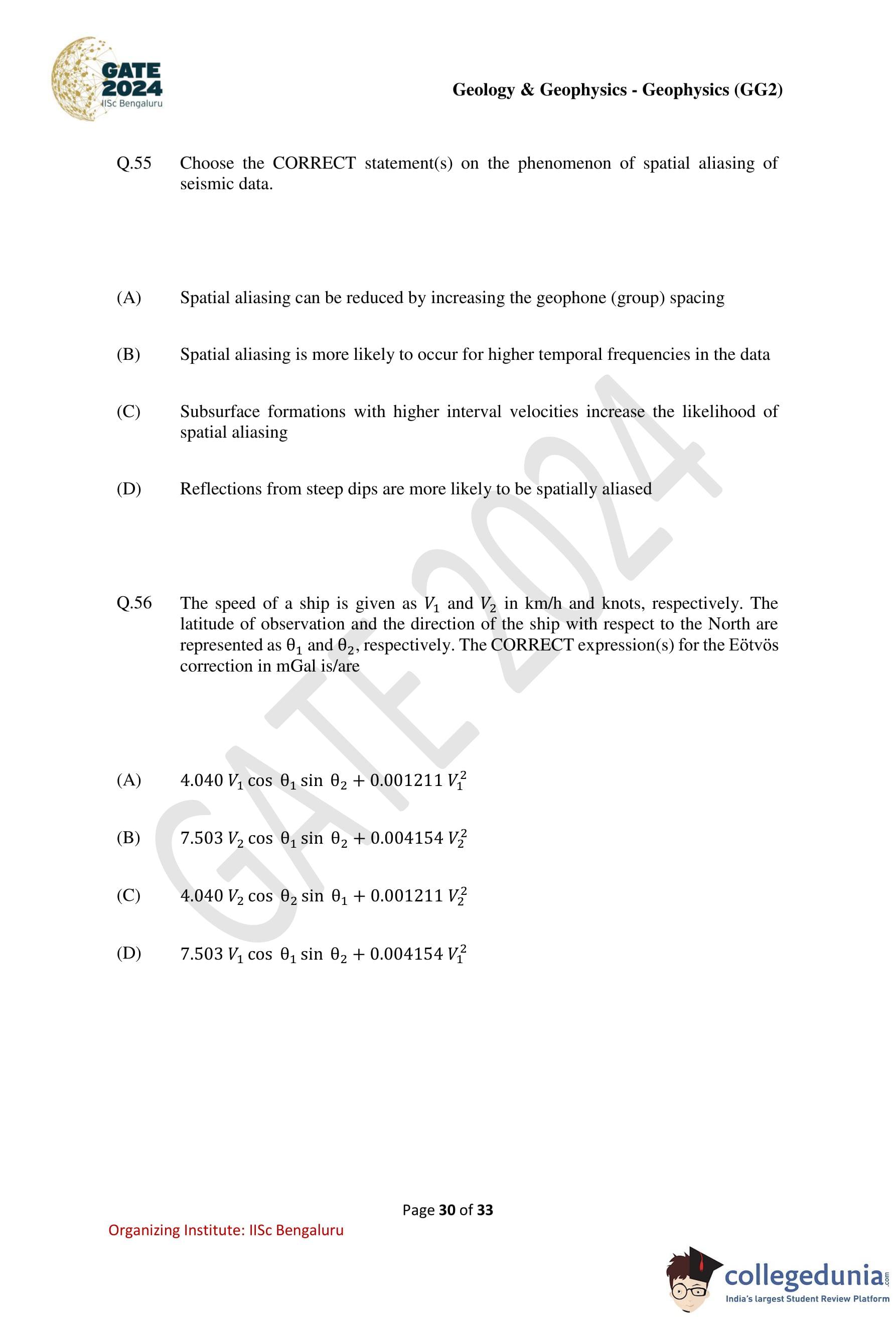 GATE 2024 Geophysics Question Paper PDF is available here. IISc Banglore conducted GATE 2024 Geophysics exam on February 4 in the Forenoon Session from 9:30 AM to 12:30 PM. Students have to answer 65 questions in GATE 2024 Geophysics Question Paper carrying a total weightage of 100 marks. 10 questions are from the General Aptitude section and 55 questions are from Core Discipline.