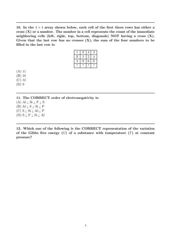 In the \(4 \times 4\) array shown below, each cell of the first three rows has either a cross (X) or a number. The number in a cell represents the count of the immediate neighboring cells (left, right, top, bottom, diagonals) NOT having a cross (X). Given that the last row has no crosses (X), the sum of the four numbers to be filled in the last row is: