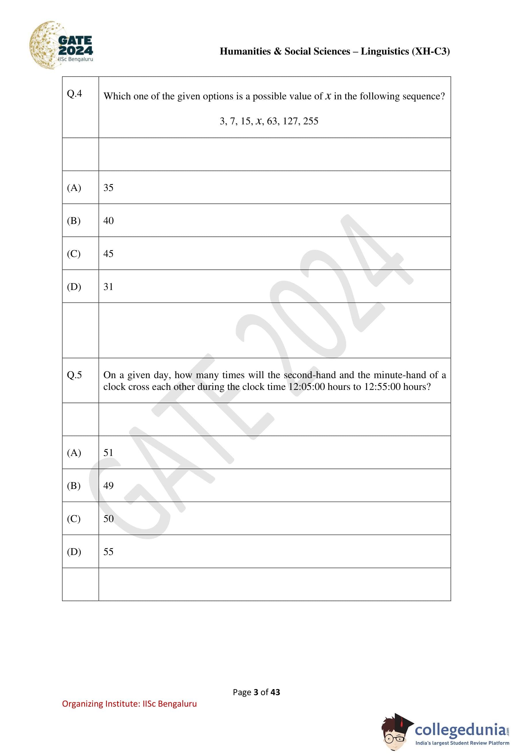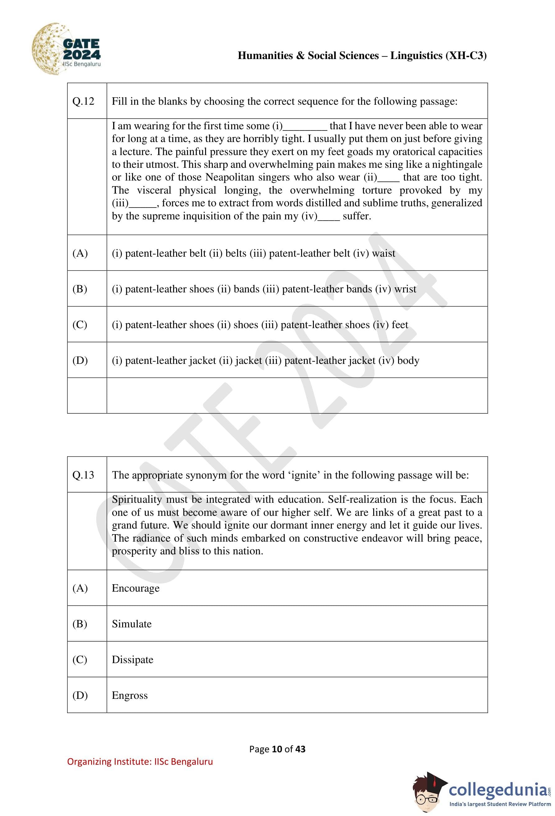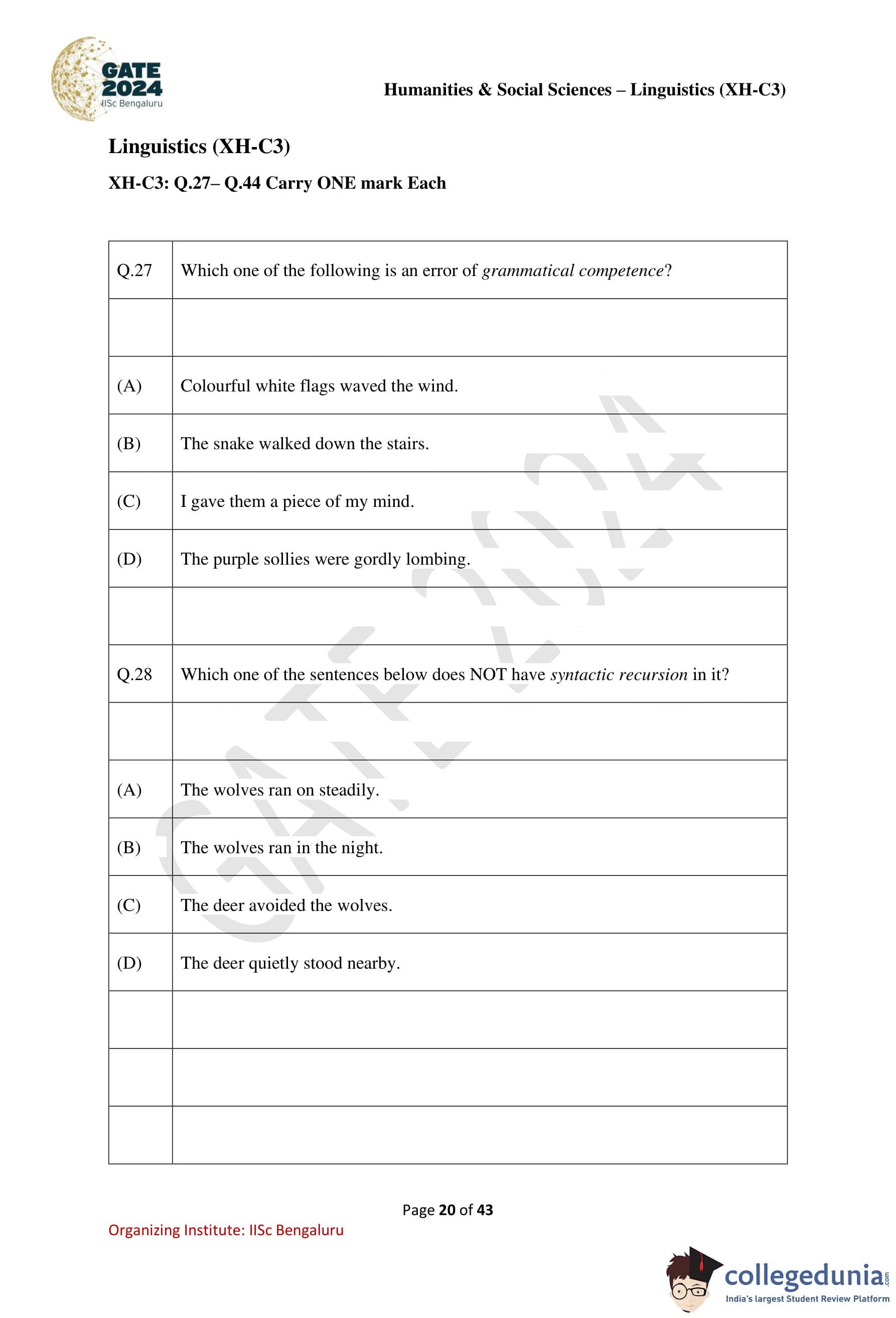 GATE 2024 Linguistics (XH-C3) Question Paper PDF is available here. IISc Banglore conducted GATE 2024 Linguistics (XH-C3) exam on February 4 in the Forenoon Session from 9:30 AM to 12:30 PM. Students have to answer 65 questions in GATE 2024 Linguistics (XH-C3) Question Paper carrying a total weightage of 100 marks. 10 questions are from the General Aptitude section and 55 questions are from Core Discipline.