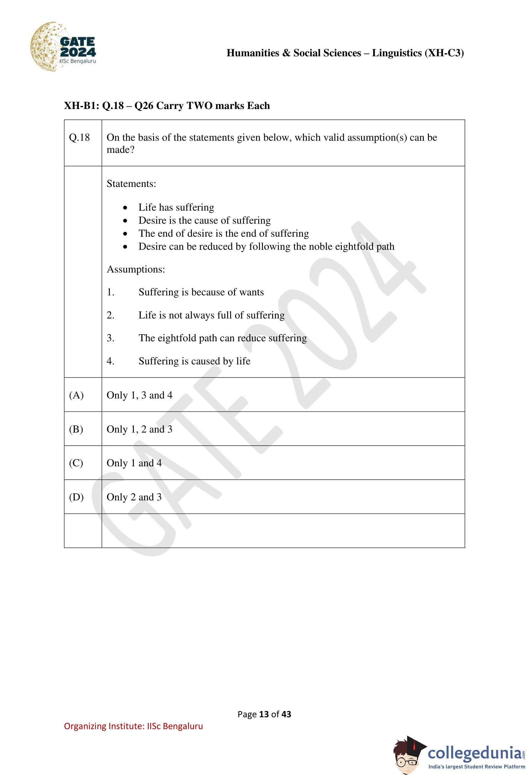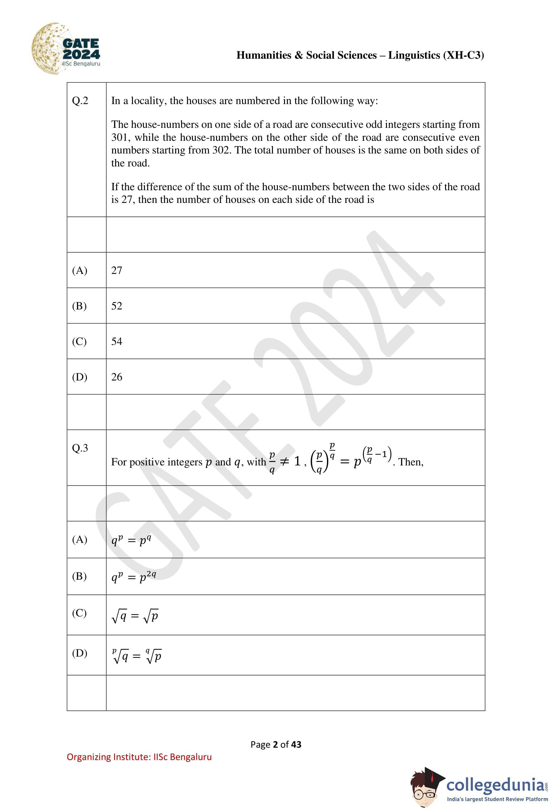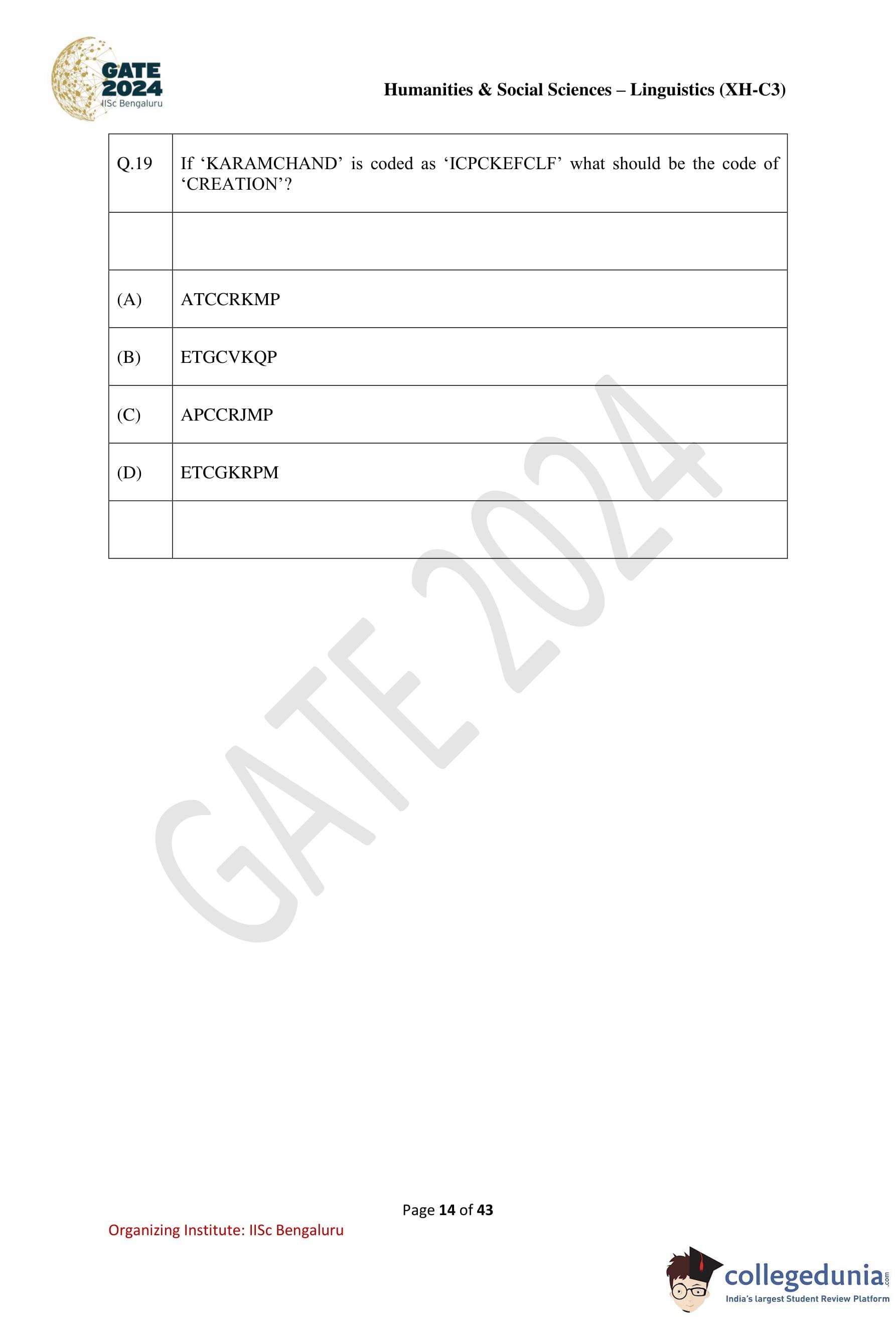 GATE 2024 Linguistics (XH-C3) Question Paper PDF is available here. IISc Banglore conducted GATE 2024 Linguistics (XH-C3) exam on February 4 in the Forenoon Session from 9:30 AM to 12:30 PM. Students have to answer 65 questions in GATE 2024 Linguistics (XH-C3) Question Paper carrying a total weightage of 100 marks. 10 questions are from the General Aptitude section and 55 questions are from Core Discipline.