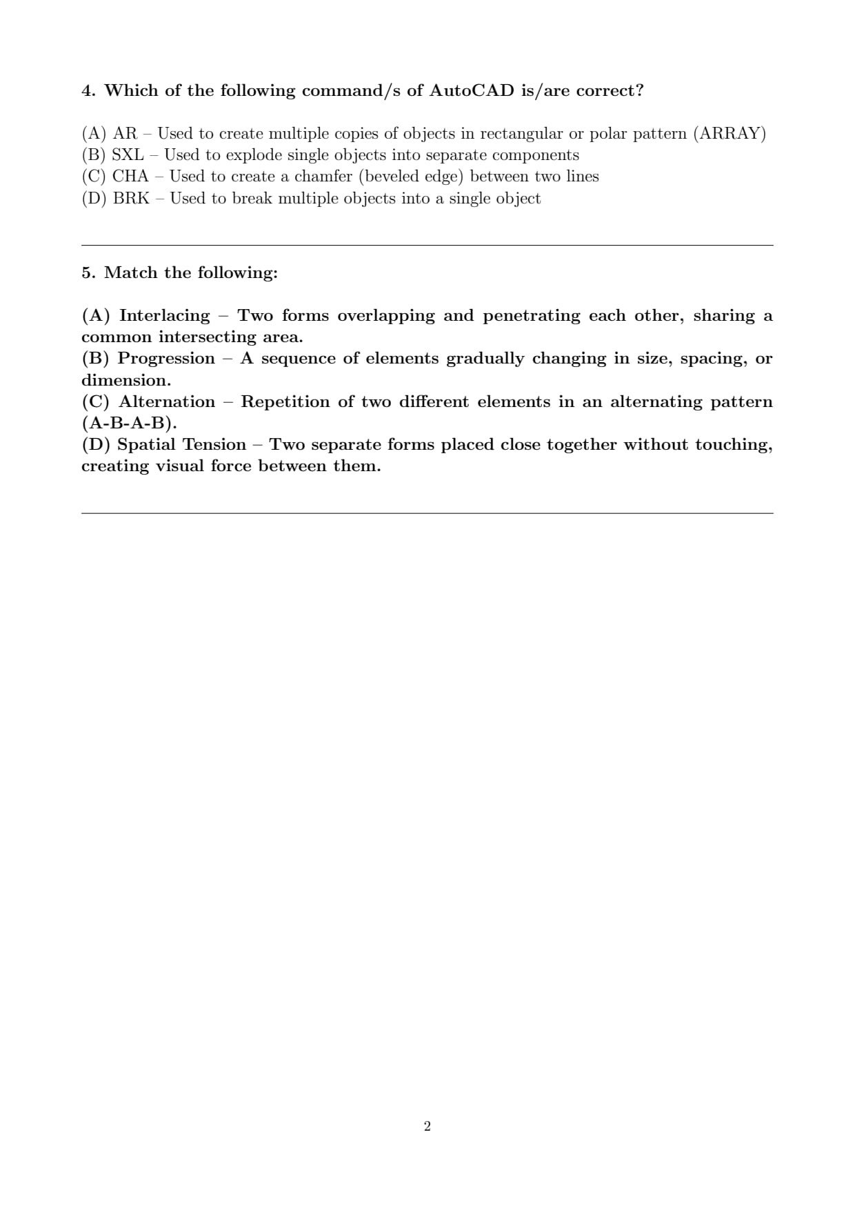 The correct AutoCAD commands and their respective descriptions are **A (AR)** and **C (CHA)**. Quick Tip: To remember AutoCAD aliases: Most are the first letter (L for Line, C for Circle) or first two/three letters (CO for Copy, CHA for Chamfer) of the actual command name.