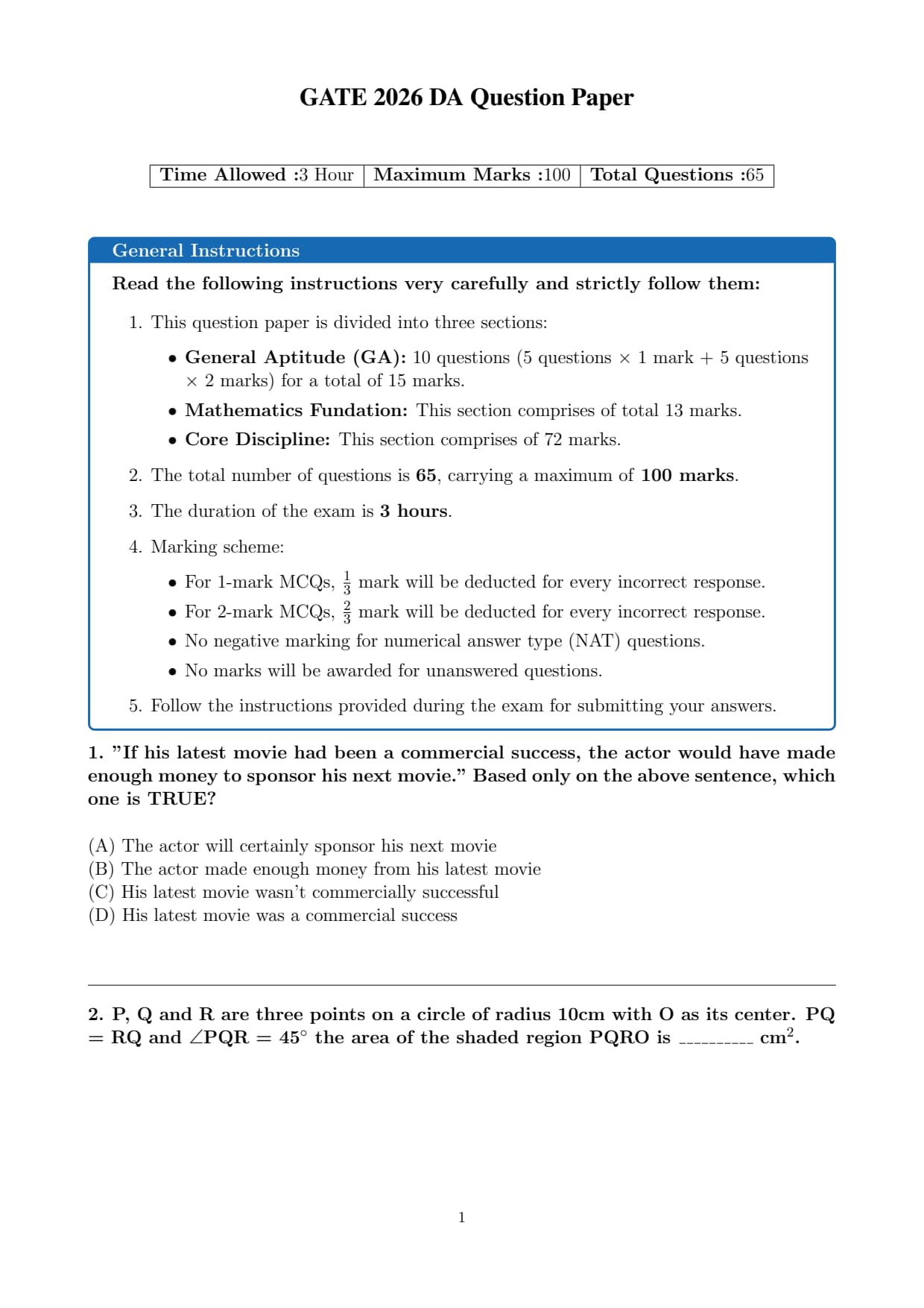 | GATE 2026 Data Science and Artificial Intelligence (DA) Question Paper | Check Solutions |
