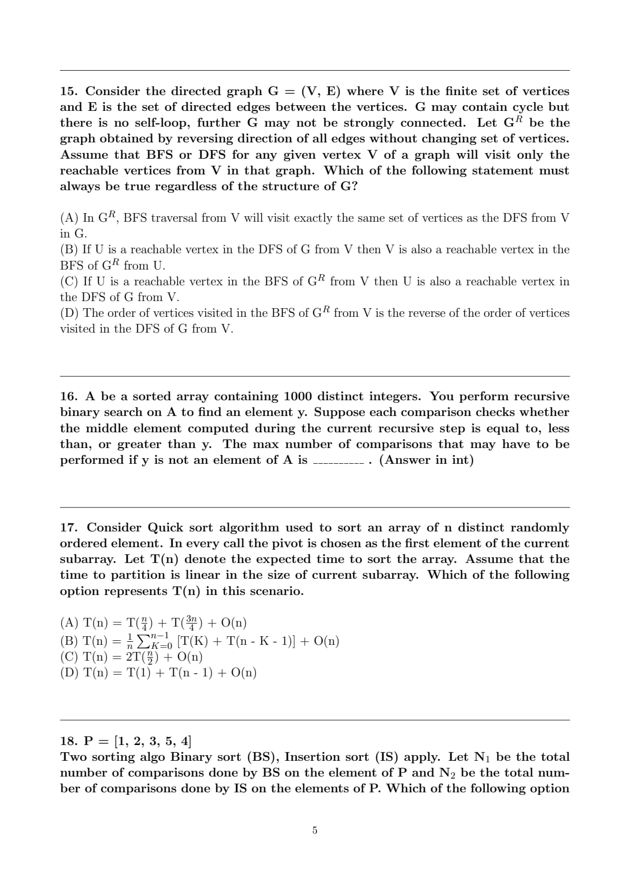 Consider the directed graph G = (V, E) where V is the finite set of vertices and E is the set of directed edges between the vertices. G may contain cycle but there is no self-loop, further G may not be strongly connected. Let G\(^R\) be the graph obtained by reversing direction of all edges without changing set of vertices. Assume that BFS or DFS for any given vertex V of a graph will visit only the reachable vertices from V in that graph. Which of the following statement must always be true regardless of the structure of G?