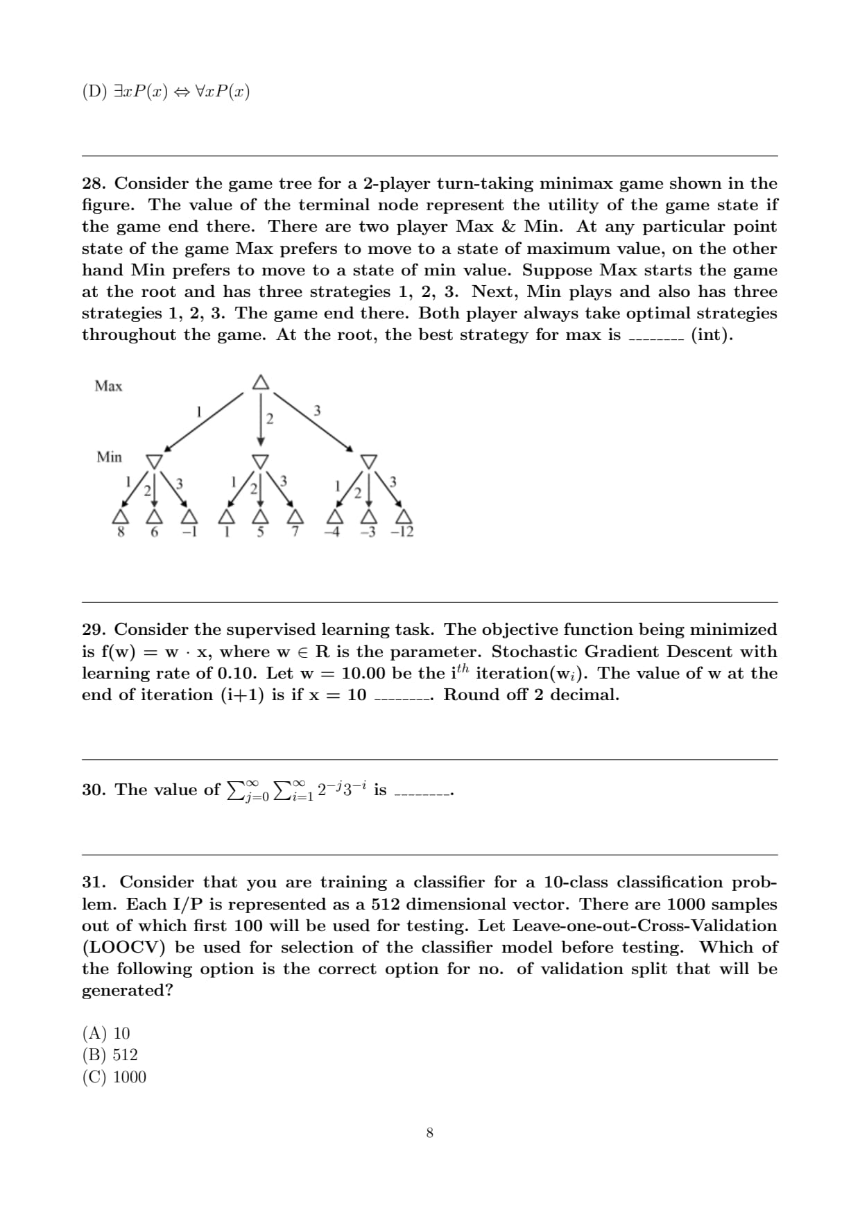 Consider the game tree for a 2-player turn-taking minimax game shown in the figure. The value of the terminal node represent the utility of the game state if the game end there. There are two player Max & Min. At any particular point state of the game Max prefers to move to a state of maximum value, on the other hand Min prefers to move to a state of min value. Suppose Max starts the game at the root and has three strategies 1, 2, 3. Next, Min plays and also has three strategies 1, 2, 3. The game end there. Both player always take optimal strategies throughout the game. At the root, the best strategy for max is ________ (int).