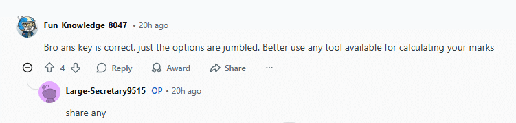 In response, another user clarified, “Bro ans key is correct, just the options are jumbled. Better use any tool available for calculating your marks.” The original poster then replied, “share any.”