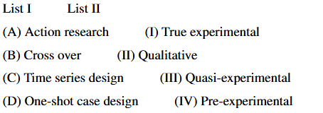 Action research is qualitative (A-II), Cross-over is true experimental (B-I), Time series is quasi-experimental (C-III), and One-shot is pre-experimental (D-IV). Quick Tip: Research designs vary in rigor; choose based on study objectives and constraints.