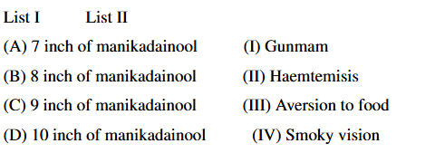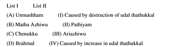 Unmashham links to Ariazhiwu (A-III), Matha Azhiwu to udal thathukkal destruction (B-I), Chenukku to increased thathukkal (C-IV), and Brahmal to Pathiyam (D-II). Quick Tip: Siddha pathology classifies diseases based on tissue-level imbalances (thathukkal).