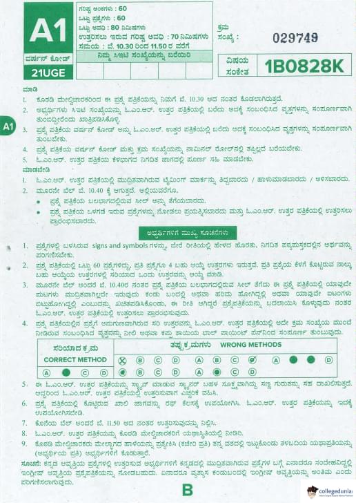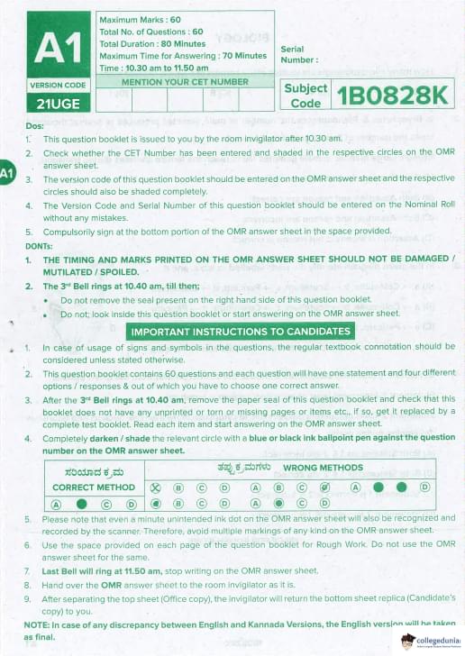 KCET 2021 Biology Question paper with answer key pdf conducted on August 28, 2021 in Morning Session 10:30 AM to 11:50 AM is available for download. The exam was successfully organized by Karnataka Examinations Authority (KEA). In terms of difficulty level, KCET was of Moderate level. The question paper comprised a total of 60 questions.