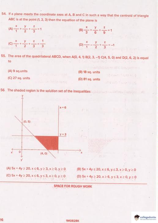 Option (C): x/1 + y/2 + z/3 = 3 → divide by 3: x/3 + y/6 + z/9 = 1 → yes! Quick Tip: Centroid of intercepts triangle = (a/3, b/3, c/3)