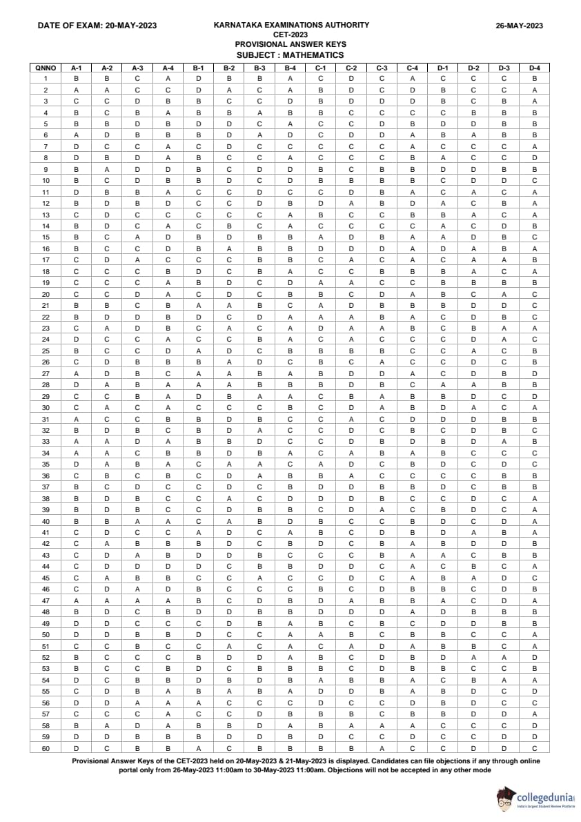 KCET 2023 Mathematics Question Paper Set B1 is available here for download. KCET 2023 Question Paper May 20 Shift 2 2:30 PM to 3:50 PM was conducted for Mathematics Paper. KCET 2023 Question Paper included 60 MCQ-based questions in total. Each candidate will be awarded +1 for correct answers, however, there will be no negative marking for incorrect responses. Students got 80 minutes to attempt KCET 2023 Mathematics Question Paper.