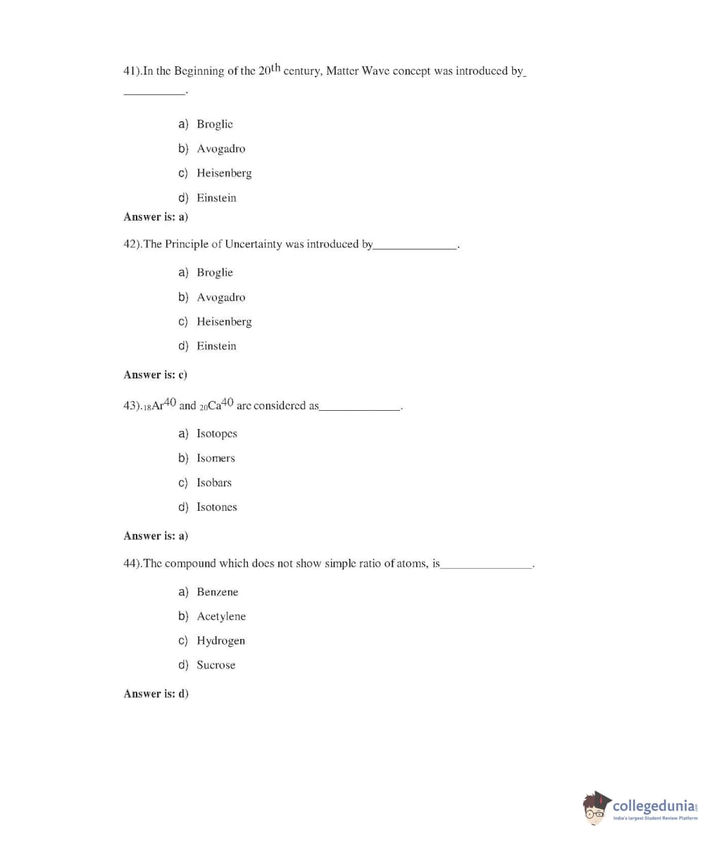 SRMS EET 2019 Chemistry Question paper with answer key pdf conducted on May 19, 2019 is available for download. The exam was successfully organized by Shri Ram Murti Smarak Engineering Institutions. The question paper comprised a total of 50 questions.