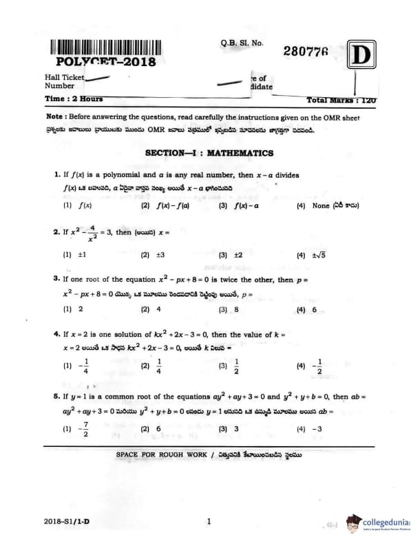TS POLYCET 2018 SET D Question paper with answer key pdf conducted on April 21 in Forenoon Session 11 AM to 1 PM is available for download. The exam was successfully organized by State Board of Technical Education and Training. The question paper comprised a total of 120 questions.