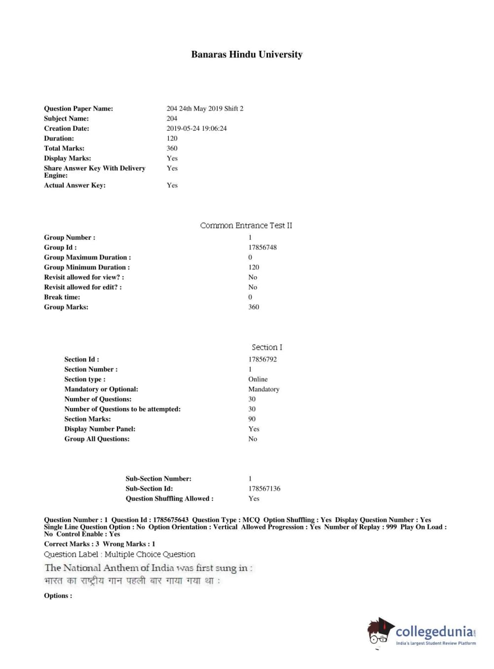 BHU PET 2019 COMMON ENTRANCE TEST 5 Question Paper with Answer Key PDFs, Shift 1