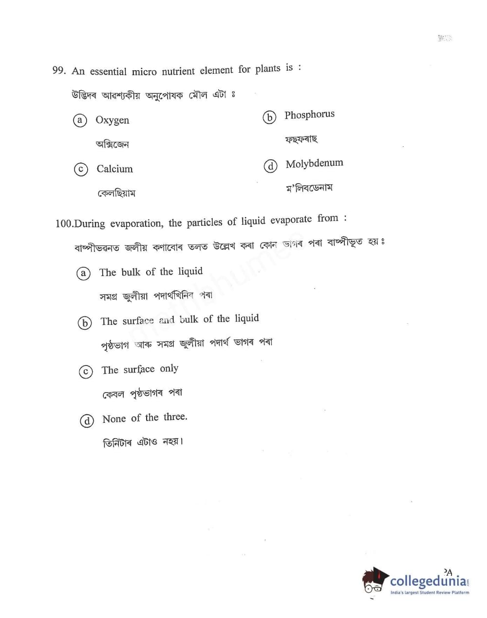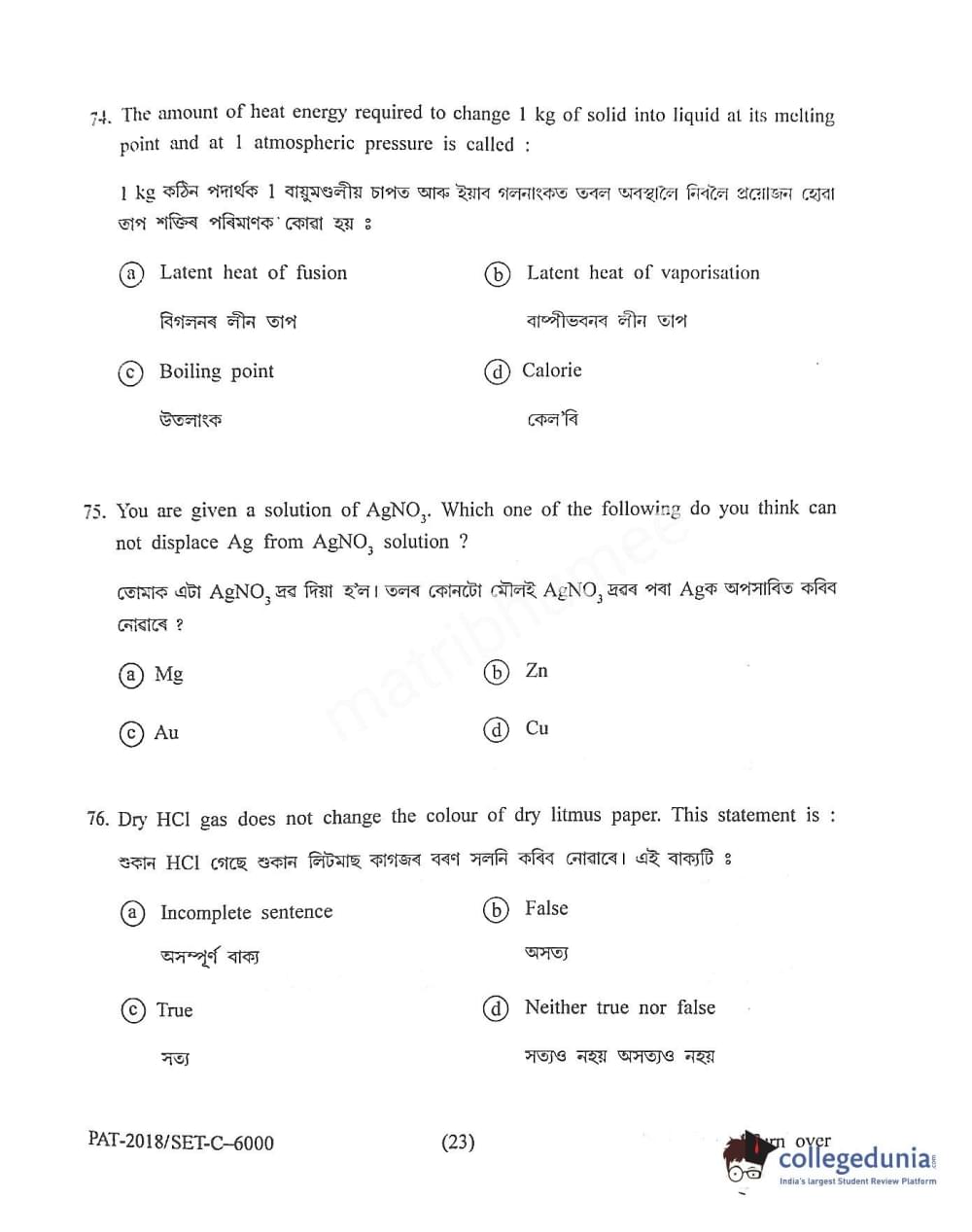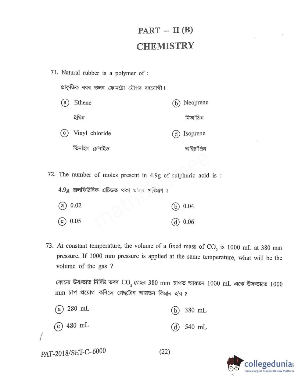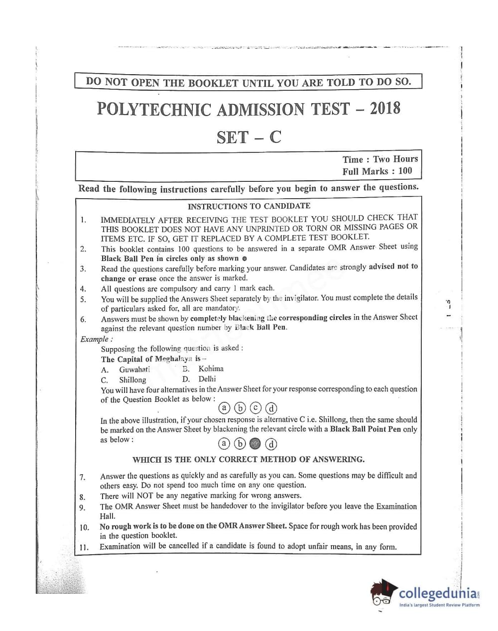 Assam PAT 2018 Question paper with answer key pdf conducted on May 20, 2018 for Set C is available for download. The exam was successfully organized by Directorate of Technical Education, Assam. The question paper comprised a total of 100 questions.