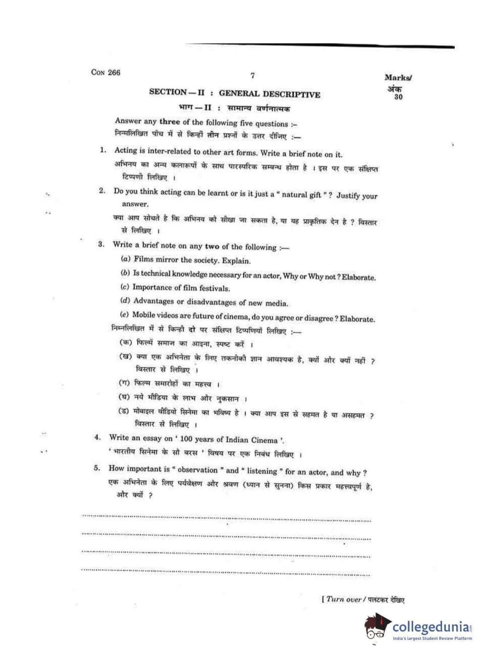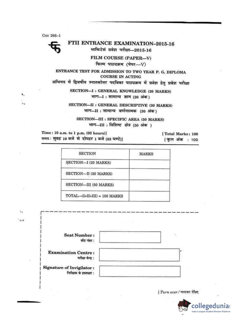 FTII Entrance Exam 2015 Two Year Post Graduate Diploma in Acting Question paper with answer key pdf conducted on August 23, 2015 in Forenoon Session (10 AM to 1 PM) is available for download. The exam was successfully organized by Film and Television Institute of India (FTII). The question paper comprised a total of 30 questions divided among three sections.