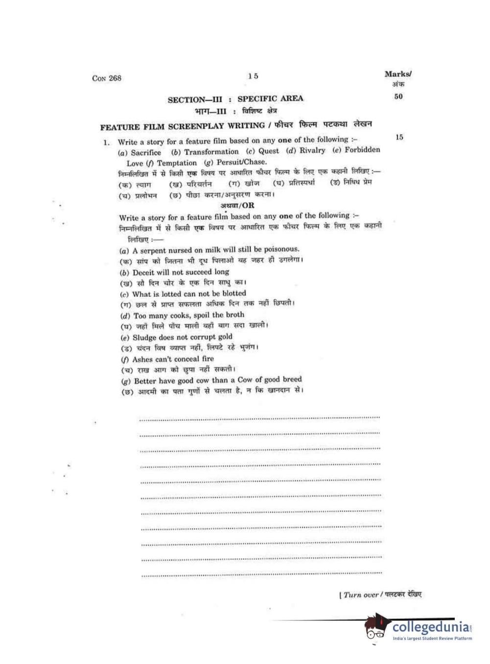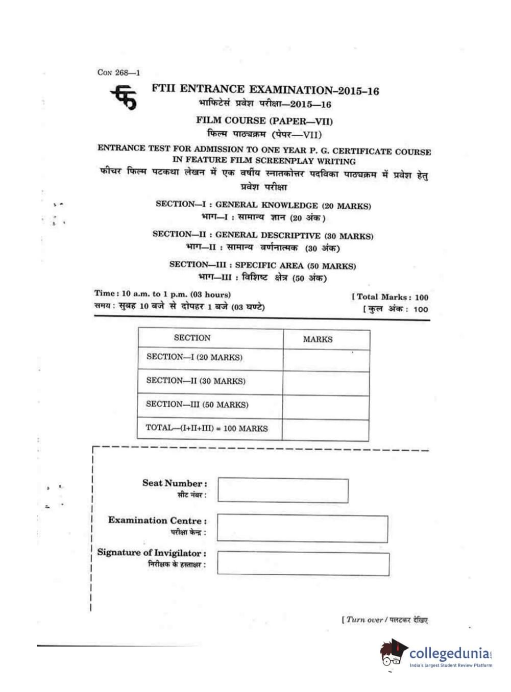 FTII Entrance Exam 2015 One Year Post Graduate Diploma in Feature Film Screenplay Writing Question paper with answer key pdf conducted on August 23, 2015 in Forenoon Session 10 AM to 1 PM is available for download. The exam was successfully organized by Film and Television Institute of India (FTII). The question paper comprised a total of 27 questions divided among three sections.