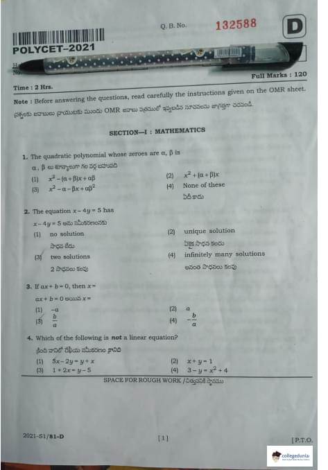 AP POLYCET 2021 Set D Question paper with answer key pdf conducted on September 1 is available for download. The exam was successfully organized by State Board of Technical Education & Training (SBTET), Andhra Pradesh. The question paper comprised a total of 120 questions.