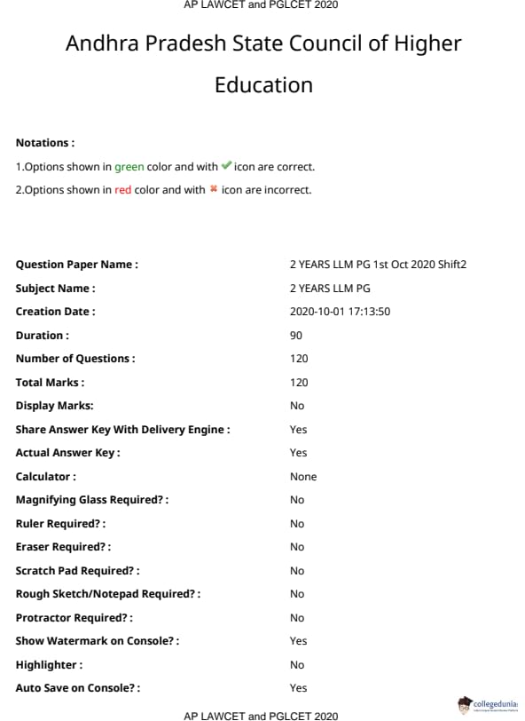 AP PGLCET 2020 LLM PG 2 Years Question paper with answer key pdf conducted on October 1, 2020 in Shift 2 is available for download. The exam was successfully organized by Sri Krishnadevaraya University, Anathapuramu. The question paper comprised a total of 120 questions.