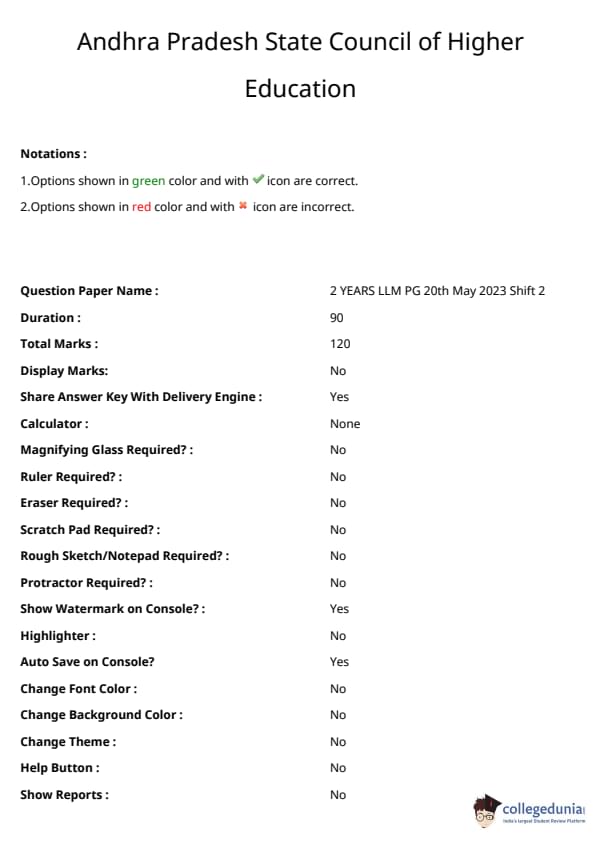 AP PGLCET 2023 LLM 2 Years Question Paper with Solution pdf is available for download. The exam was conducted by Acharya Nagarjuna University, Guntur on behalf of APSCHE on May 20, 2023 in Shift 2. The question paper comprised a total of 120 questions.